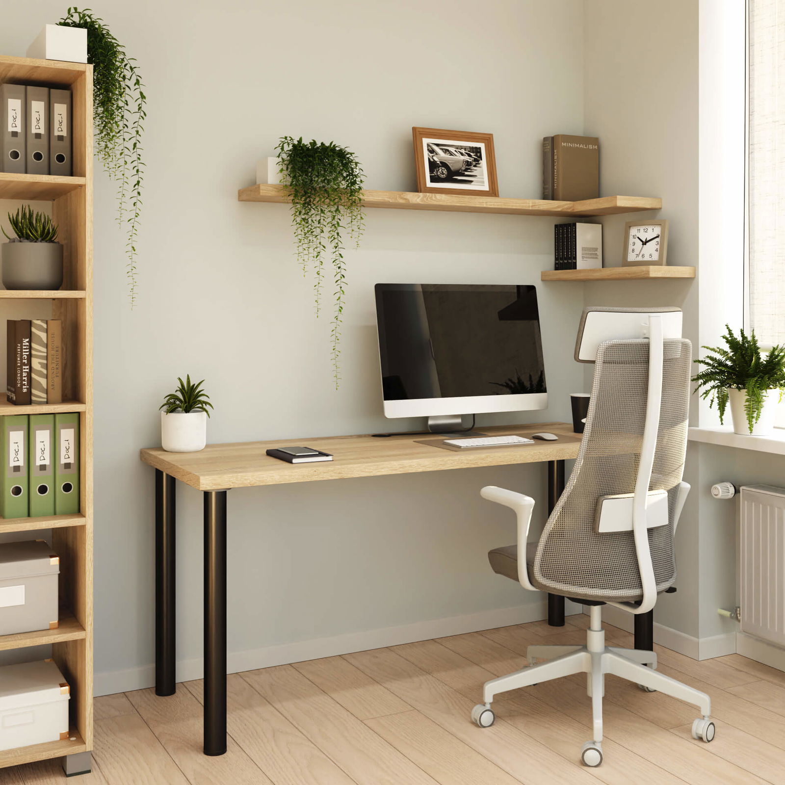 Stabilne metalowe nogi – czarna stalowa konstrukcja o średnicy 80 mm gwarantuje solidność i dodaje biurku nowoczesnego charakteru.
