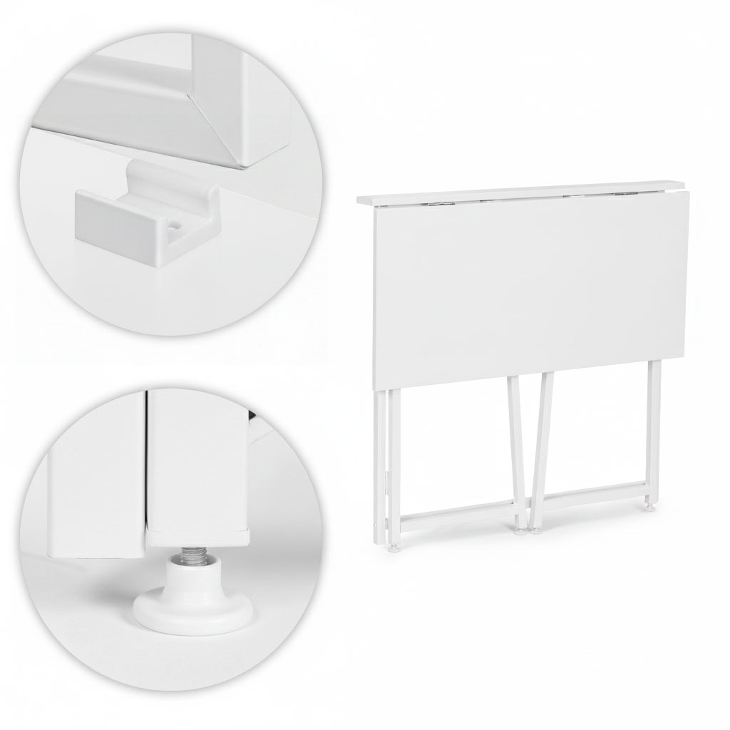- Składany mechanizm nóg został zaprojektowany z myślą o szybkim użytkowaniu i oszczędności miejsca. Solidne zawiasy umożliwiają łatwe złożenie biurka na płasko, co pozwala przechowywać je nawet w bardzo wąskich przestrzeniach.