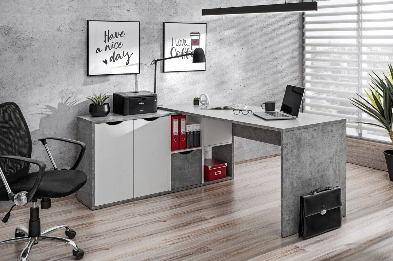 Biurko narożne, ARTEO, 160x67x77 cm, biały, szary, mat. Modne biurko z możliwością rozbudowy. Ergonomicznej wielkości blat zapewnia dużą ilość miejsca do wygodnej nauki czy pracy. Otwarte półki oraz wysuwane pojemniki pomogą zorganizować wymarzoną biblioteczkę, ale także umożliwią przechowywanie akcesoriów biurowych.