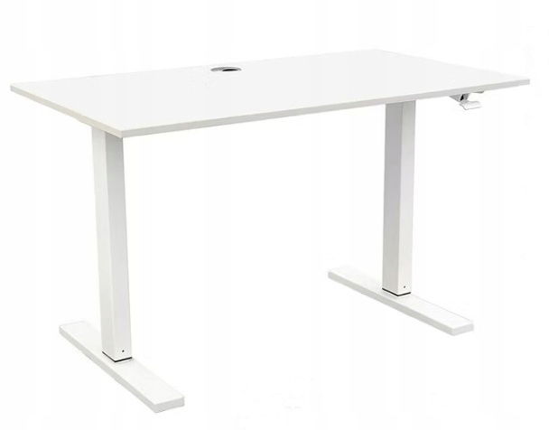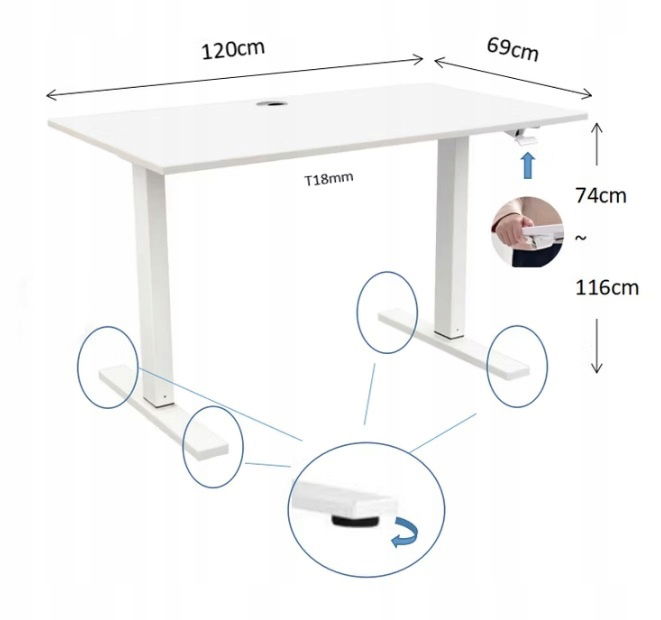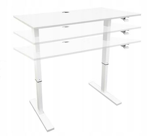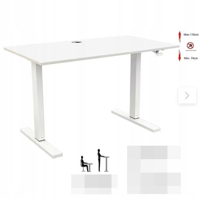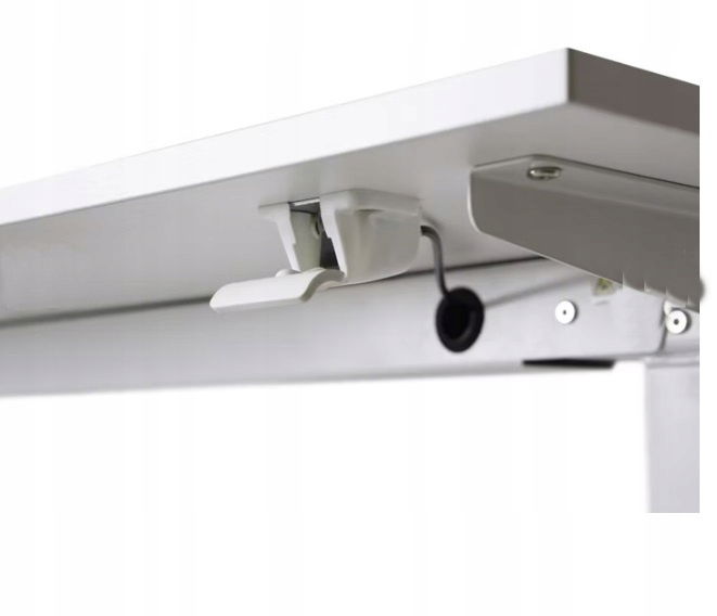 Regulacja wysokości za pomocą systemu sprężyn gazowych (bez użycia siły) - Płynnie regulowany mechanizm za pomocą sprężyny pozwala na łatwe i płynne przejście z pozycji siedzącej do stojącej w ciągu kilku sekund. Biurko można łatwo podnieść, naciskając dźwignię z boku biurka i podnosząc je na żądaną wysokość. Aby obniżyć biurko, naciśnij dźwignię i przyłóż siłę 10-20 kg w dół. Zakres regulacji wysokości wynosi od 74 cm do 116 cm.
