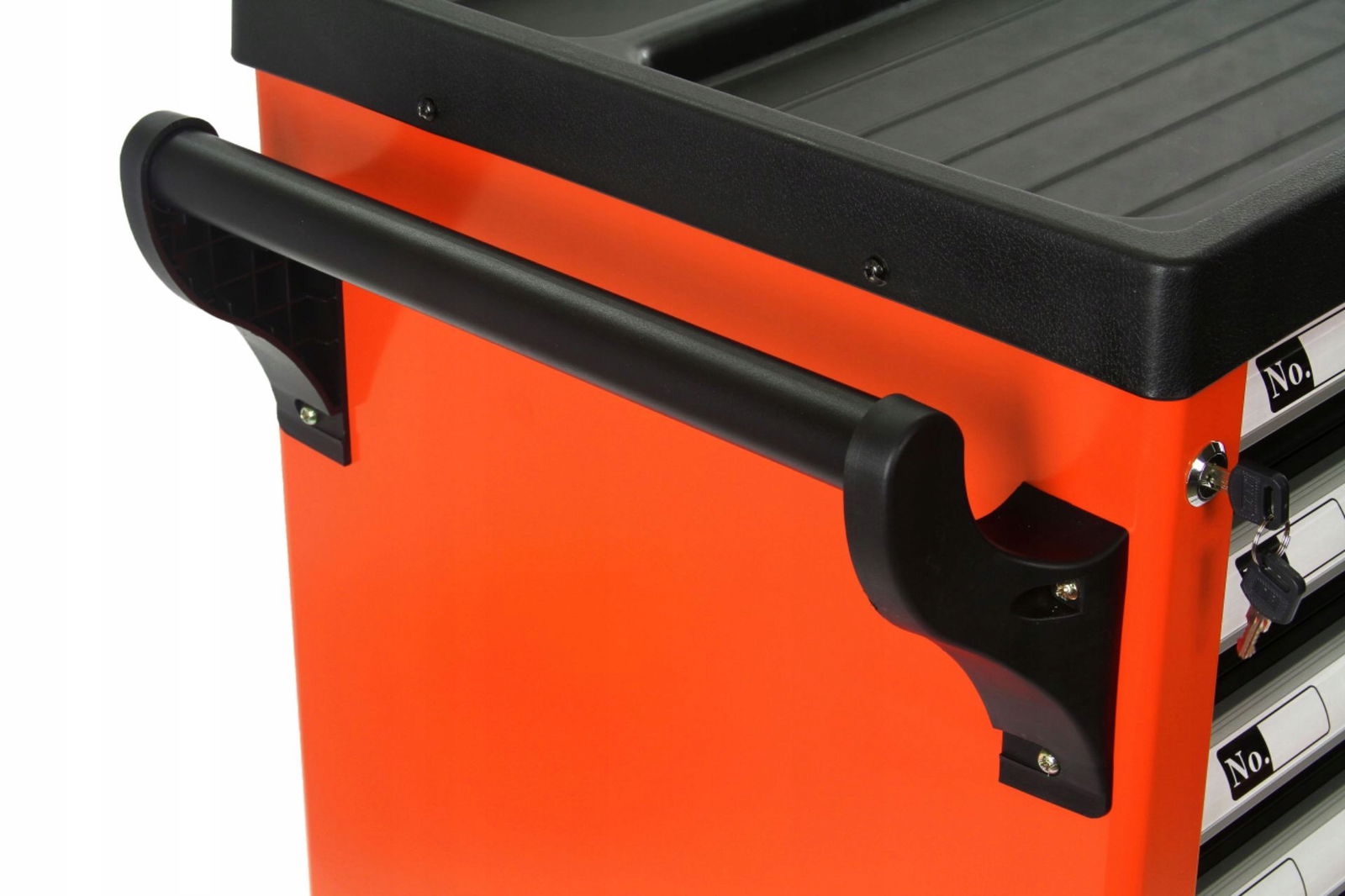 Centralny zamek z dwoma kluczami zamykający wszystkie szuflady oraz podwójne ściank i zabezpieczają narzędzia przed niepożądanym dostępem lub kradzieżą , zapasowy kluczyk w zestawie w przypadku zgubienia jednej sztuki.