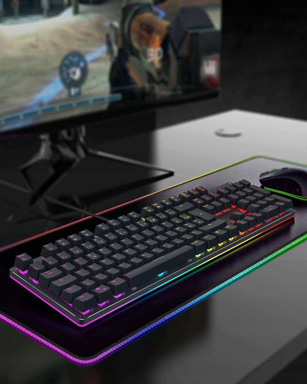 - Pełna ochrona przed GHOWANIAMI i PROGRAMOWANIE: Klawiatura do gier PC jest wyposażona w 105 klawiszy, które zapewniają dokładność jednoczesnych naciśnięć klawiszy podczas intensywnej gry i szybkiego pisania. Wszystkie klucze można ponownie przypisywać, a makra mogą być tworzone w celu bezproblemowej obsługi.
