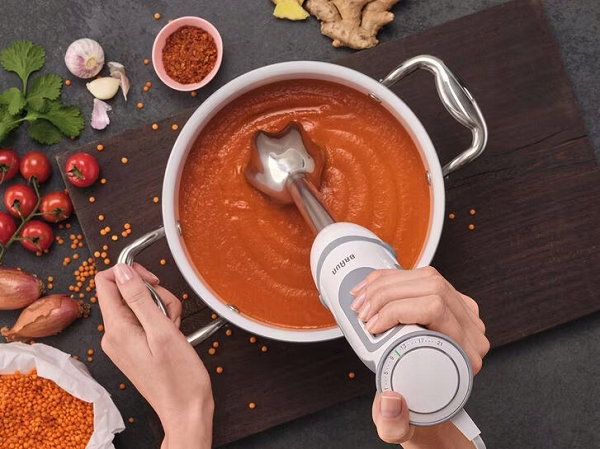 Nowoczesny kielich z przedziałką ułatwi odmierzenie składników i przyrządzenie kremowych zup, sosów, koktajli i przecierów.