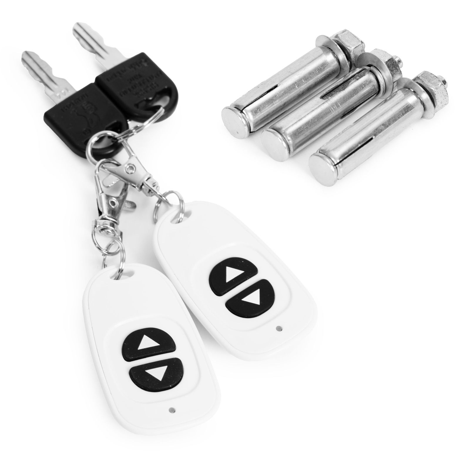 - W zestawie:2piloty, 2 klucze, 8 kotw montażowych, 3 baterie