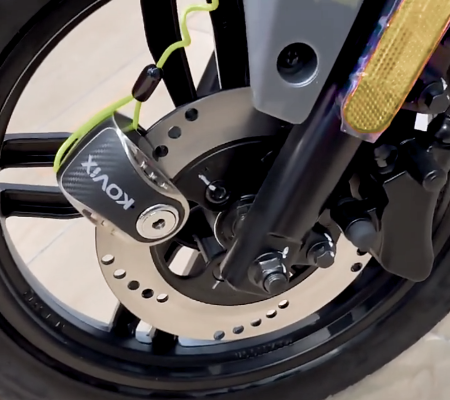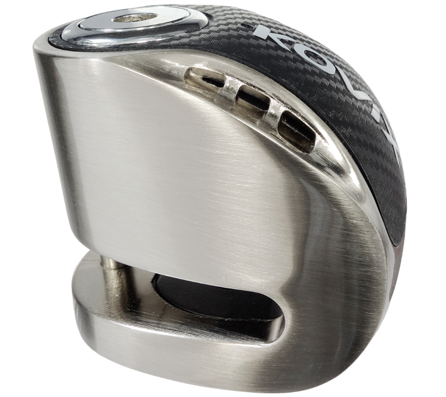 Blokada tarczy hamulcowej z wbudowanych alarmem o natężeniu dźwięku 120 dB z możliwością ustawiania opcji syreny ON/OFF. Zamek ze stali nierdzewnej i wodoodporne podzespoły elektryczne gwarantują ochronę przed korozją i niezawodność w każdych warunkach atmosferycznych. Blokada wyposażona jest w długo pracującą i przyjazną dla środowiska litową baterię. Zabezpieczenie blokuje koło bolcem o średnicy 5,5 mm, przez co uniemożliwia jazdę i ruch motocykla lub skutera.