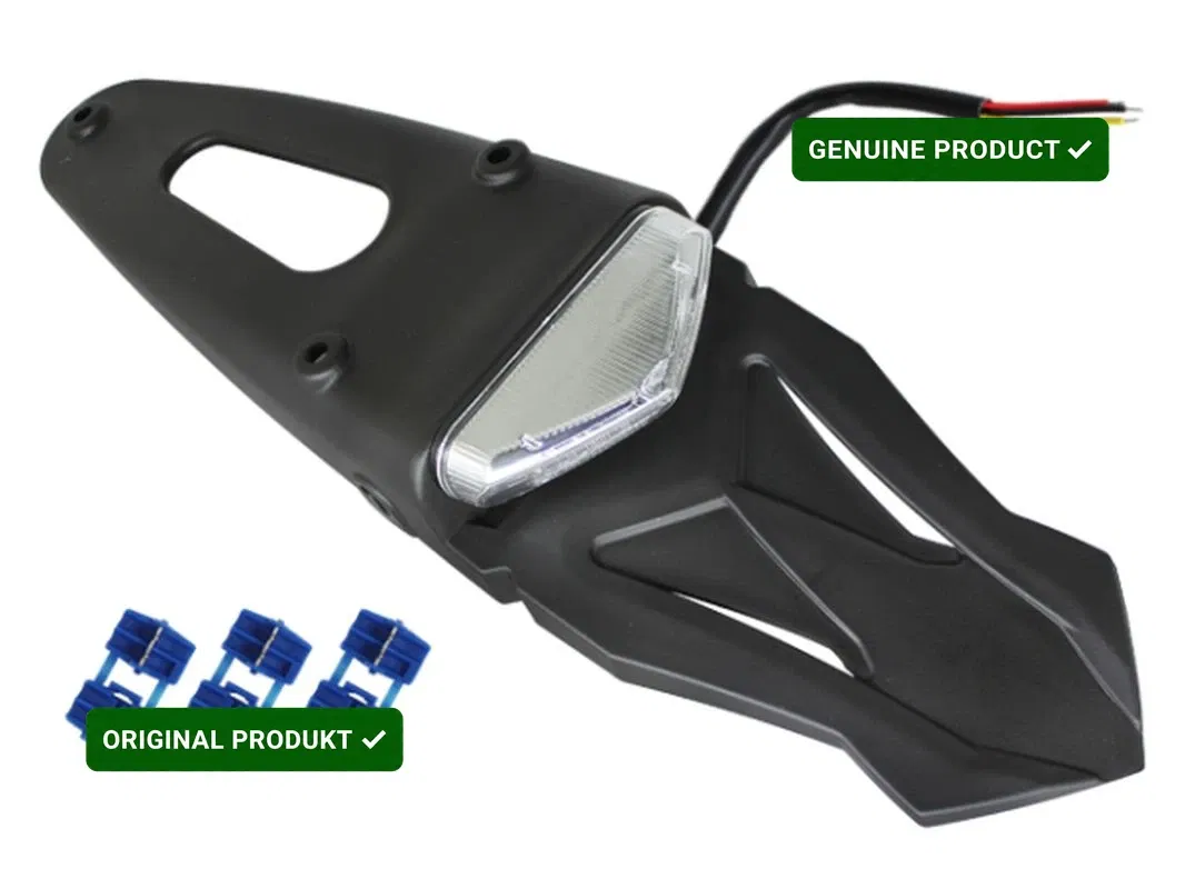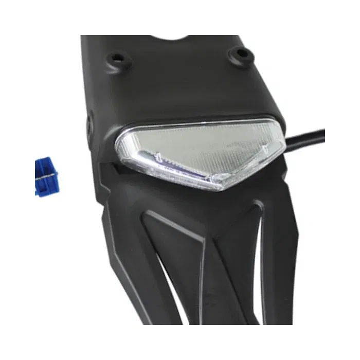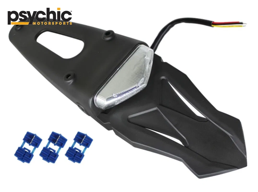 Uniwersalny tylny błotnik enduro marki Psychic, wyposażony w zintegrowaną, homologowaną lampkę LED w kolorze białym. Zaprojektowany do motocykli enduro, zapewnia estetyczne i funkcjonalne rozwiązanie oświetleniowe zgodne z przepisami drogowymi.