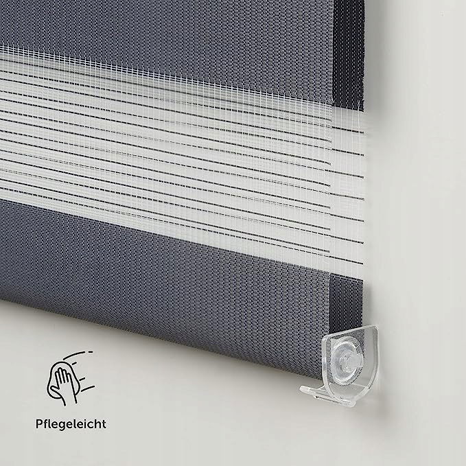 Nowoczesność: wytrzymała tkanina wykonana w 100% z poliestru jest łatwa w czyszczeniu i można ją przetrzeć wilgotną ściereczką. Przezroczyste i nieprzezroczyste paski zapewniają nowoczesny wygląd. Wielobarwne paski rolet zebry tworzą piękny efekt gradientu w odcieniach bieli/szarości lub czerni/ bieli.