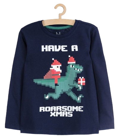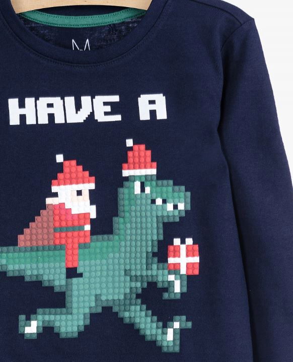 Motyw – Na froncie znajduje się nadruk z wypukłymi elementami, przedstawiający Mikołaja, który pędzi z prezentami na plecach dużego, zabawnego dinozaura. Motyw wykonany w stylu klocków LEGO na pewno przypadnie do gustu każdemu małemu fanowi gier i zabaw kreatywnych.