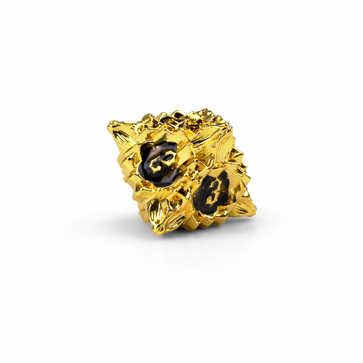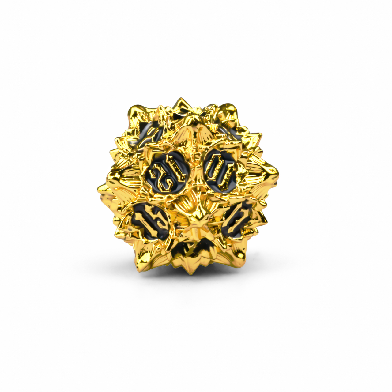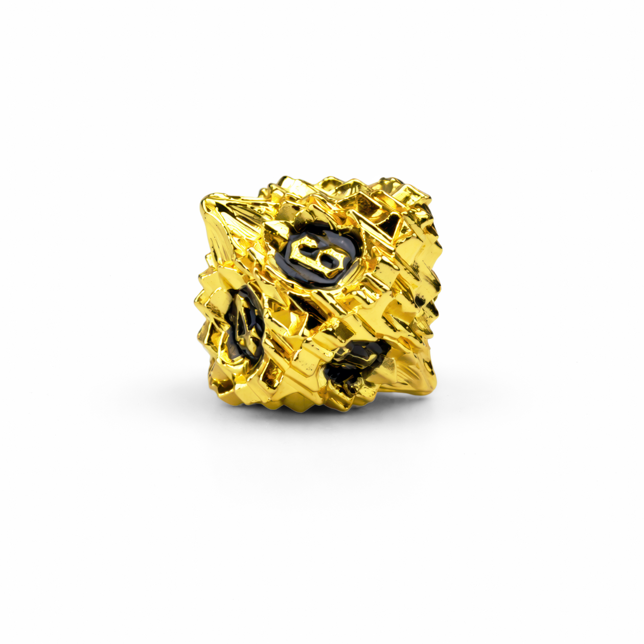 Na Gridzie każda decyzja jest jak równanie—czyste linie, ostre krawędzie i światło, które niemal słychać—dlatego ten Set idealnie dorzuca futurystyczny klimat do Twojej sesji. Przy rozmiarze 3 cm te metalowe kości są „do dłoni”, ale robią ogromne wrażenie: lustrzanie złote wykończenie i poszarpane, gwiaździste żłobienia wyglądają jak rozbita geometria zatrzymana w ruchu. Na każdej ściance masz głębokie, czarne wgłębienia, a złote cyfry mocno odcinają się od tła, dając efekt czarno-złotego, ekranowego kontrastu. To takie małe rzeźby, jeszcze zanim w ogóle nimi rzucisz. W trakcie gry czujesz różnicę od razu: solidny ciężar metalu, przyjemny „klik” na stole i błyski światła tańczące po ostrych fasetach. Całość kojarzy się z połączeniem wypolerowanego pancerza i cyfrowej architektury—dokładnie ten elegancki, kontrastowy vibe, który fani Trona uwielbiają. Postaw je na biurku jako ozdobę, weź do kampanii sci-fi/cyberpunk dla natychmiastowego klimatu albo podaruj komuś, kto nadal śni o obwodach—i niech każdy rzut brzmi jak brawurowy sprint przez Grid.