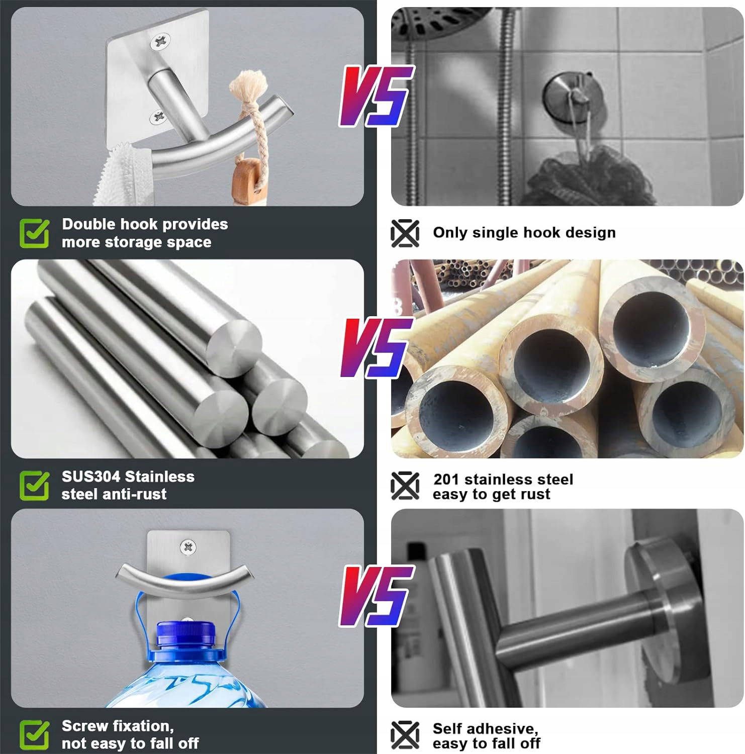 Wysokiej jakości hak ze stopu cynku i stal nierdzewna 304 jako podstawa, wysokiej jakości proces galwanizacji i malowania, bardzo trwała konstrukcja. Nie jest łatwo pozostawić zacieki, plamy i rdzę. Nadaje się jako wieszak na ręcznik łazienkowy, wieszak na płaszcze, wieszak na szlafrok itp.