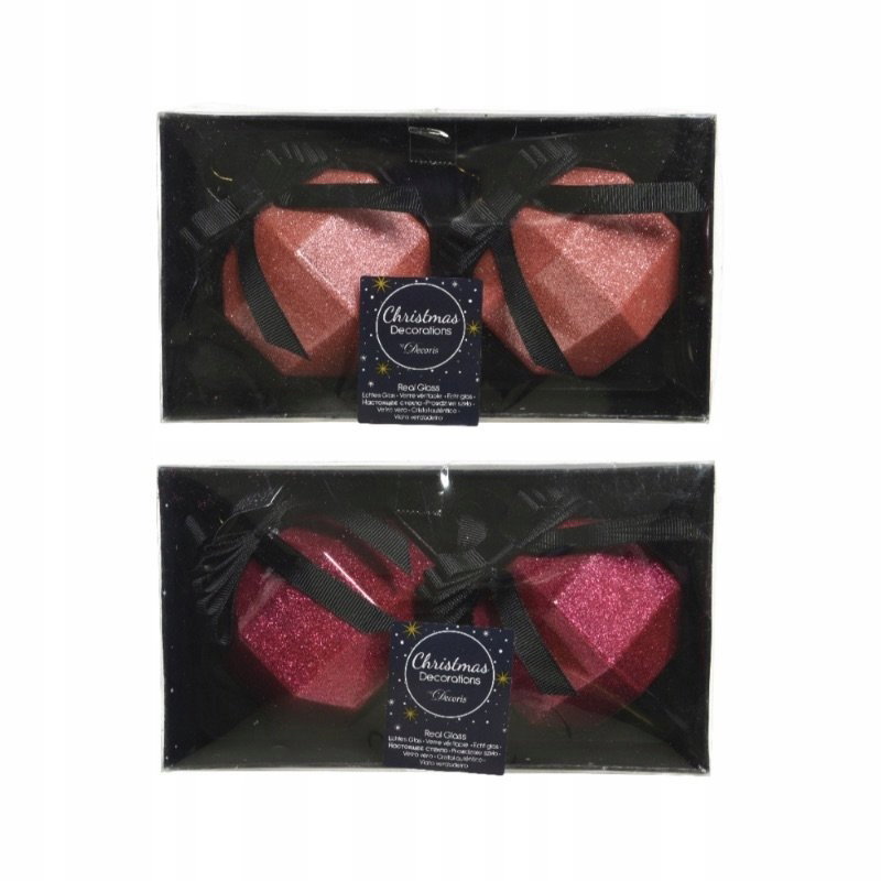 4 szklane bombki Decoris w kolorze ciemnoróżowym o kształcie kanciastej kuli. Pod zewnętrzną warstwą koloru umieszczone zostały brokatowe drobinki, co sprawia, że bombka ładnie odbija światło. U góry ozdobiona czarną wstążką. Średnica 8 cm.
