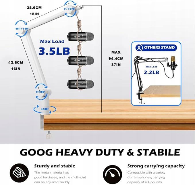 Wytrzymały stojak na mikrofon - wykonany z nowego ABS i stopu, podwójne ramiona nośne wytrzymują większy ciężar, co zapewnia większą wytrzymałość, super mocne sprężyny zapobiegają przypadkowemu upuszczeniu mikrofonu, powodowaniu hałasu i drżeniu, wytrzymują obciążenie do 3,5 funta. Posiada solidny zacisk w kształcie litery C, który można przymocować do krawędzi biurka i który nie przesuwa się ani nie przesuwa podczas użytkowania. .
