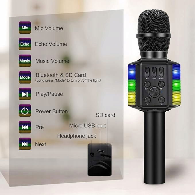 Wielokolorowe światło taneczne: Dostosowane do imprez, zajęć wewnątrz/na zewnątrz i wywiadów. Na mikrofonie karaoke znajduje się wiele świateł LED, które migają wraz ze wzrostem głośności, tworząc cieplejszą atmosferę.