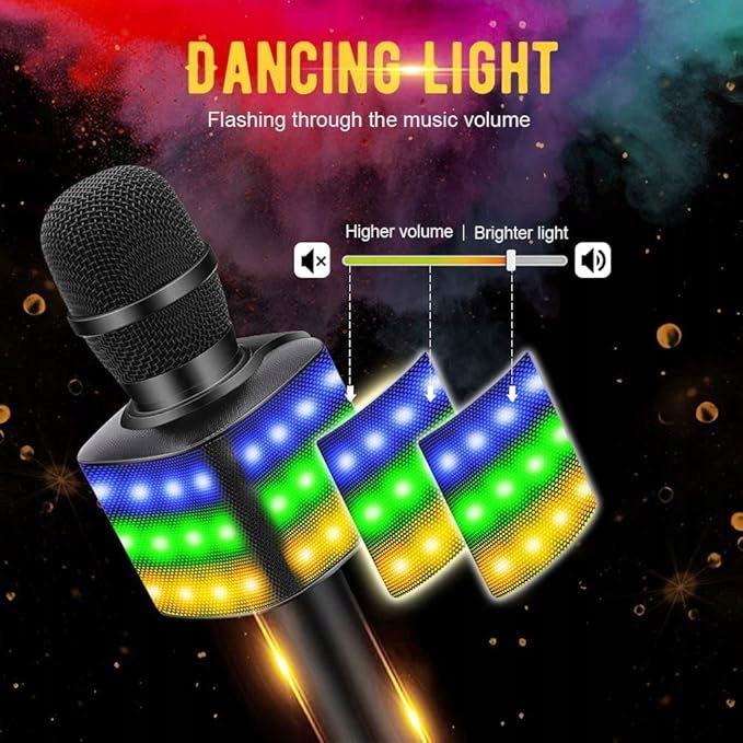 Wielokolorowe światło taneczne: Dostosowane do imprez, zajęć wewnątrz/na zewnątrz i wywiadów. Na mikrofonie karaoke znajduje się wiele świateł LED, które migają wraz ze wzrostem głośności, tworząc cieplejszą atmosferę.