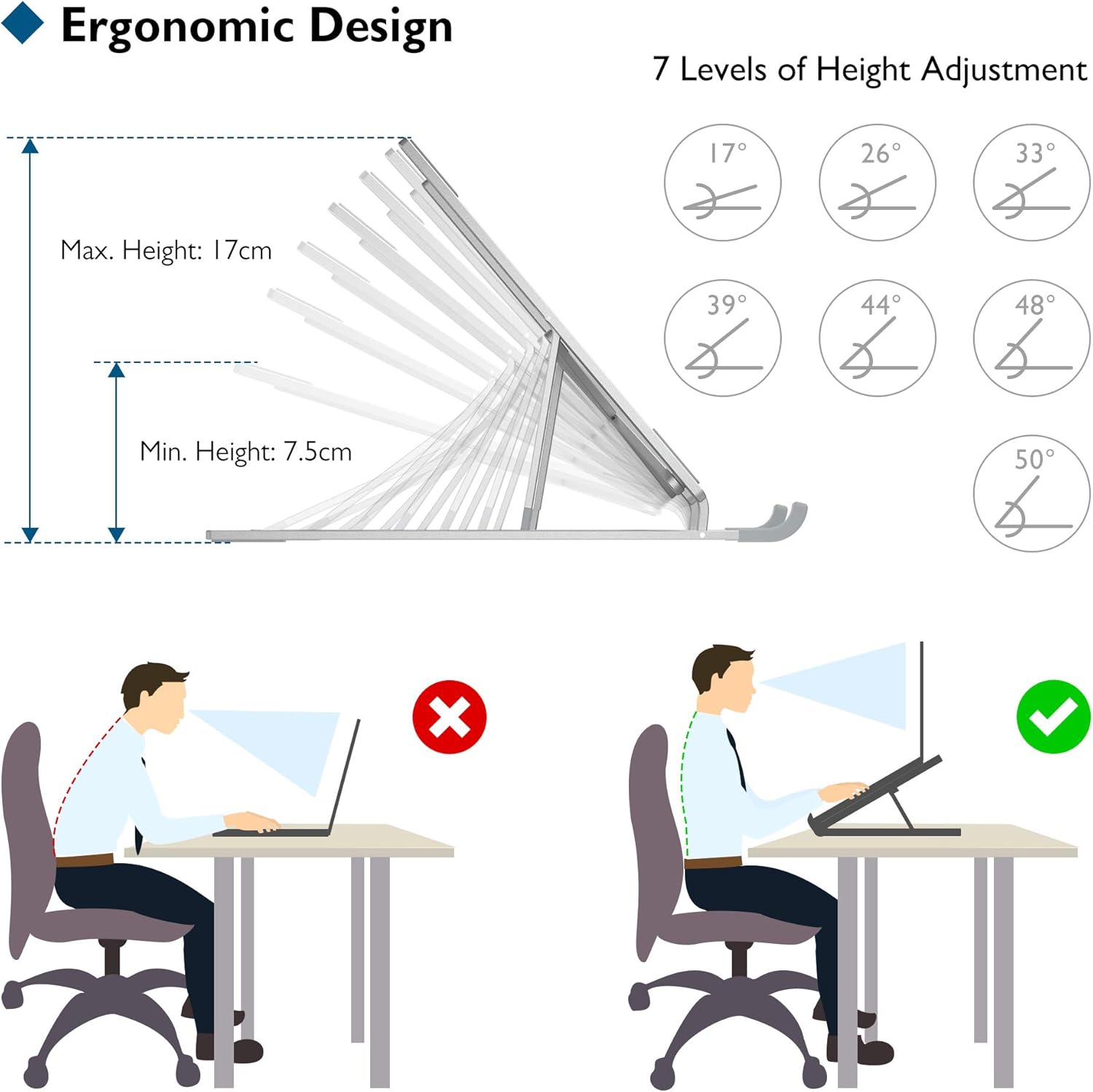 ⭐Ergonomiczna Regulacja Wysokości i Kąta dla Maksymalnego Komfortu: Przenośny stojak na laptopa oferuje 7 poziomów regulacji wysokości (7,5 cm do 17 cm) oraz 7 różnych kątów ustawienia (od 17° do 50°), umożliwiając idealne dostosowanie ekranu do poziomu oczu. Redukuje zmęczenie szyi, pleców oraz oczu, poprawiając postawę i komfort pracy. Doskonały wybór do biura, domu, szkoły, kawiarni, oraz hotelu. Idealny do długotrwałego użytkowania zarówno w pracy, jak i w czasie rozrywki.