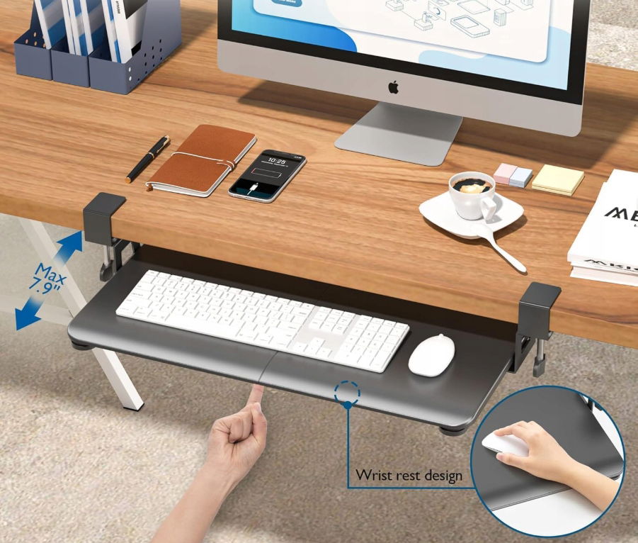 - ✴️Ergonomiczne użytkowanie: Wysuwana taca na klawiaturę pozwala na łatwe wsunięcie i wysunięcie klawiatury, co poprawia ergonomię pracy. Wysunięcie do 200 mm od krawędzi biurka umożliwia wygodne kąty pisania, redukując napięcie w nadgarstkach i ramionach.