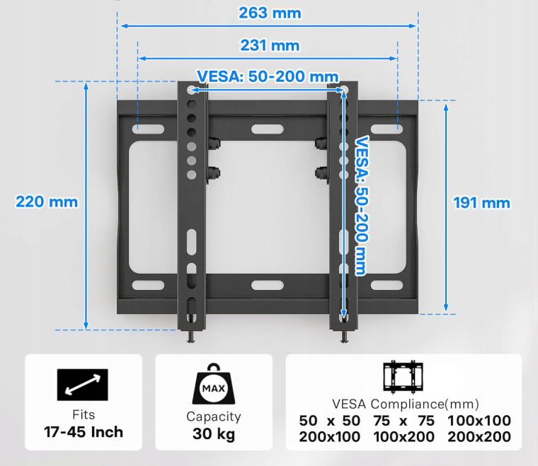 - ✴️ Uniwersalna kompatybilność VESA-Pasuje do telewizorów 17–45 cali oraz standardów VESA 50×50, 75×75, 100×100, 100×200, 200×100 i 200×200 mm; maksymalna nośność do 30 kg.