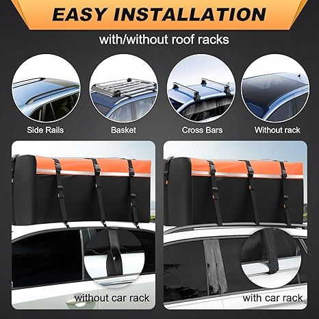 - 【TRWAŁY I ODPORNY NA WARUNKI ATMOSFERYCZNE】Aby sprostać wszelkim warunkom pogodowym, ten bagażnik dachowy bez relingu dachowego został udoskonalony: dodano wodoodporny zamek błyskawiczny, wydłużono rzepy na suwakach oraz zastosowano podwójne, wzmacniające szwy. Dzięki temu Twoje rzeczy pozostaną suche i bezpieczne nawet podczas ulewnego deszczu lub śniegu.