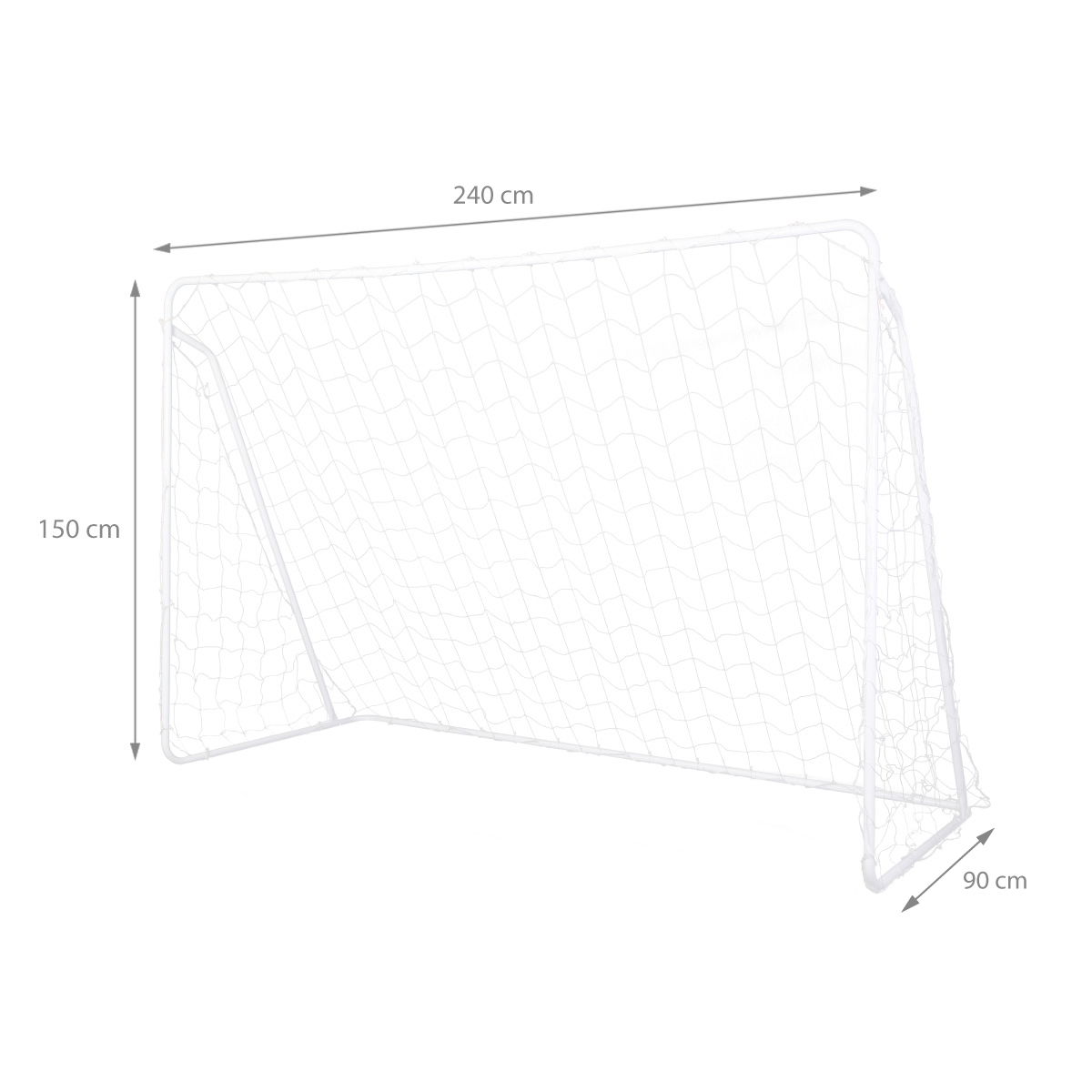 **Parametry produktu:** * **Model:** BR240P * **Typ:** Wolnostojąca bramka piłkarska z panelem treningowym * **Materiał konstrukcji:** Stalowe profile (25 mm) * **Materiał siatki:** Polietylen (PE) * **Wymiary bramki:** * Długość: 240 cm * Wysokość: 150 cm * Szerokość: 90 cm * **Średnica otworu w panelu:** 41 cm * **Wielkość oczka w siatce:** 12 x 12 cm * **Waga produktu:** 3,35 kg * **Zestaw zawiera:** Stelaż, siatkę, 8 kotw, panel do treningu precyzyjnych strzałów, sznurek * **Przeznaczenie:** Użytek amatorski (nie komercyjny)