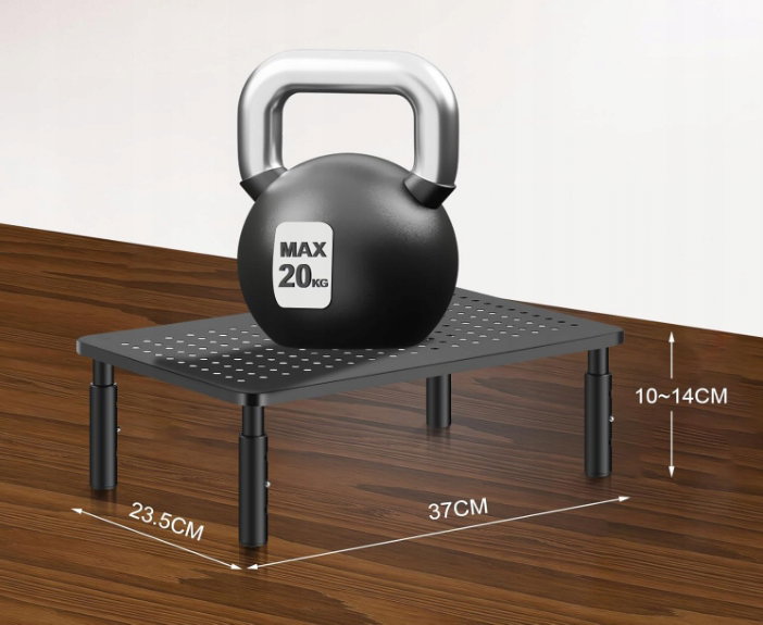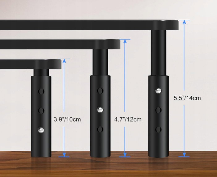 - ✴️3 USTAWIENIA WYSOKOŚCI – Pasuje do wszystkich marek laptopów i modeli laptopów, drukarek, konsol do gier, telewizorów i innych urządzeń. Wyposażony w platformę o wymiarach 370 x 235 mm (D x S), ten stojak może podnieść Twój monitor o 3 regulowane poziomy wysokości (100 mm/120 mm/140 mm). Maksymalizuj przestrzeń na biurku i utrzymuj monitor na odpowiedniej wysokości. Wystarczy nacisnąć przycisk na nodze i podnieść platformę, aby dostosować różne poziomy wysokości.