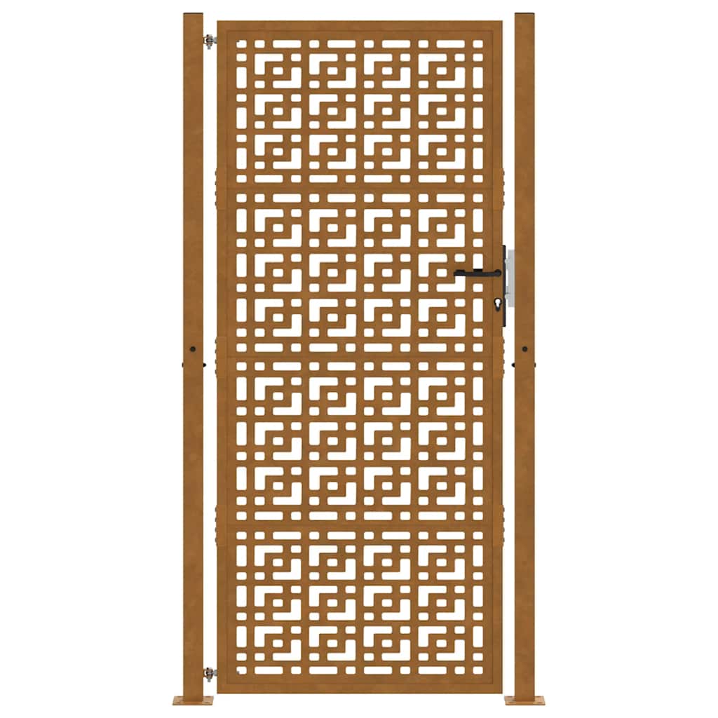 Brama ogrodowa, stanowiąca doskonałe połączenie wytrzymałości i elegancji, to idealne przejście do ogrodu lub patio. Solidna konstrukcja: Ta brama ogrodzeniowa jest wykonana ze stali odpornej na warunki atmosferyczne. Stal odporna na warunki atmosferyczne jest z natury odporna na korozję. W kontakcie z czynnikami atmosferycznymi tworzy się na niej rdzawa warstwa chroniąca przed niszczeniem. Nie wymaga więc malowania. Pozwoli to zaoszczędzić na kosztach konserwacji i napraw. Wyrazisty brązowy kolor stali kortenowskiej z pewnością przyciągnie wzrok. Co więcej stal ta jest wyjątkowo trwała i wytrzyma próbę czasu.Wycinany laserowo wzór: furtkę zdobi piękny, wycinany laserowo wzór, który dodaje niepowtarzalnego uroku Twojej przestrzeni przydomowej.Zamykana konstrukcja: brama zewnętrzna jest wyposażona w solidny system blokowania, w którego skład wchodzą trzy pasujące klucze, co gwarantuje, że bramę tarasową można bezpiecznie zamknąć.Łatwy montaż: bramka jest dostarczana w komplecie z dwoma słupkami z płytkami kołnierzowymi i akcesoriami montażowymi ułatwiającymi mocowanie.Szerokie zastosowanie: Brama metalowa doskonale nadaje się do upiększania wjazdów do ogrodu, podjazdów i granic posesji, łącząc w sobie funkcjonalność i walory wizualne. Warto wiedzieć:W momencie dostawy produkt nie jest jeszcze zardzewiały i ma normalny kolor metalu. Rdza pojawi się z czasem. Można przyspieszyć proces rdzewienia, spryskując produkt wodą z mydłem lub słoną wodą. Aby uchronić ubrania przed plamami, należy unikać kontaktu z powstającą warstwą rdzy.