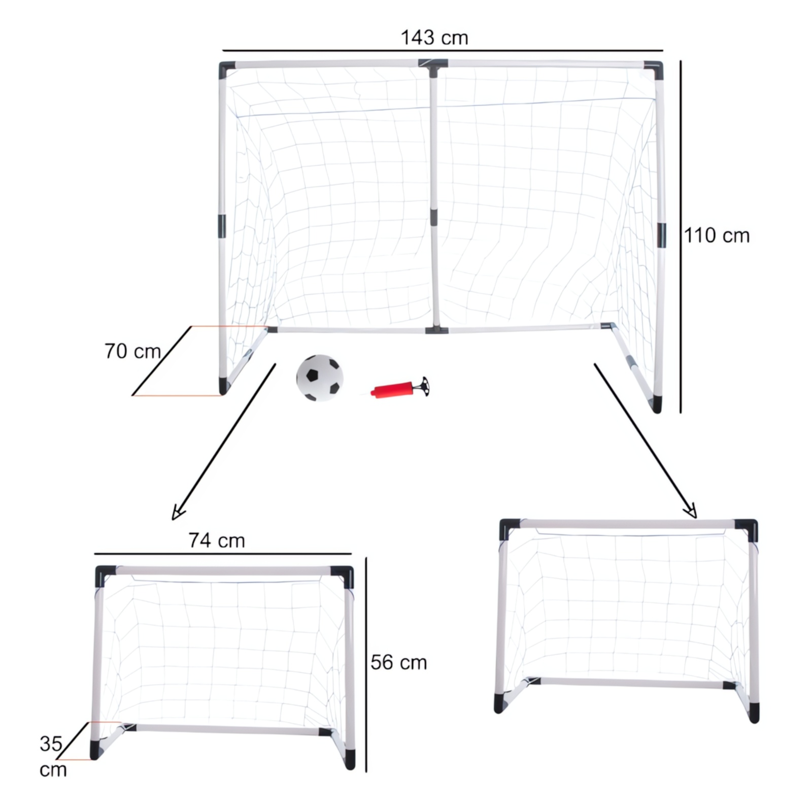 - Wymiary bramki dużej: 143 × 110 × 70 cm