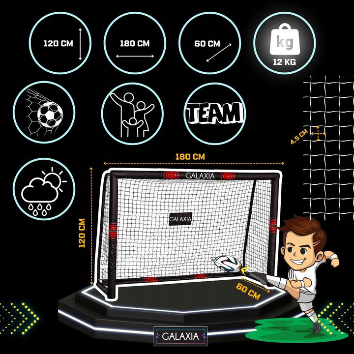 Bramka do piłki nożnej Galaxia ma wymiary 180 x 120 x 60 cm, co czyni ją idealną zarówno dla dzieci, jak i dorosłych.