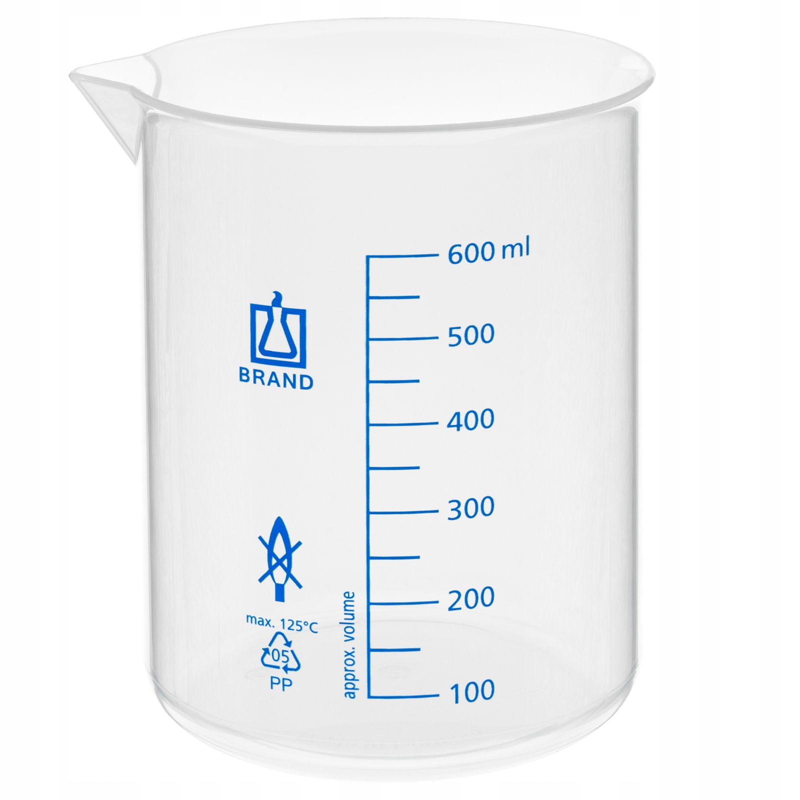 Zlewka niska o pojemności 600 ml wykonana z polipropylenu (PP), o wysokiej przezroczystości. Posiada niebieską nadrukowaną skalę z podziałką co 50 ml, wzmocniony rant oraz dzióbek ułatwiający wylewanie cieczy. Zaleca się czyszczenie w temperaturze do 60 °C. Do autoklawowania rekomendowane są wersje ze skalą wytłaczaną. Model o wysokości 127 mm i średnicy 100 mm.