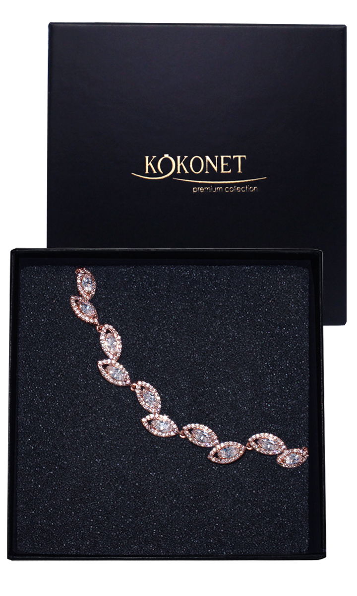 Ta bransoletka z listkami i cyrkoniami w kolorze różowego złota to idealny wybór dla kobiet, które szukają biżuterii lekkiej, a zarazem efektownej. Misternie połączone detale tworzą lśniącą kaskadę, która pięknie układa się na nadgarstku i współgra z każdym Twoim ruchem. To doskonała biżuteria ślubna boho, która w połączeniu z pasującymi kolczykami stworzy spójny i olśniewający komplet. Idealnie sprawdzi się również jako pamiątkowy prezent dla panny młodej lub świadkowej.