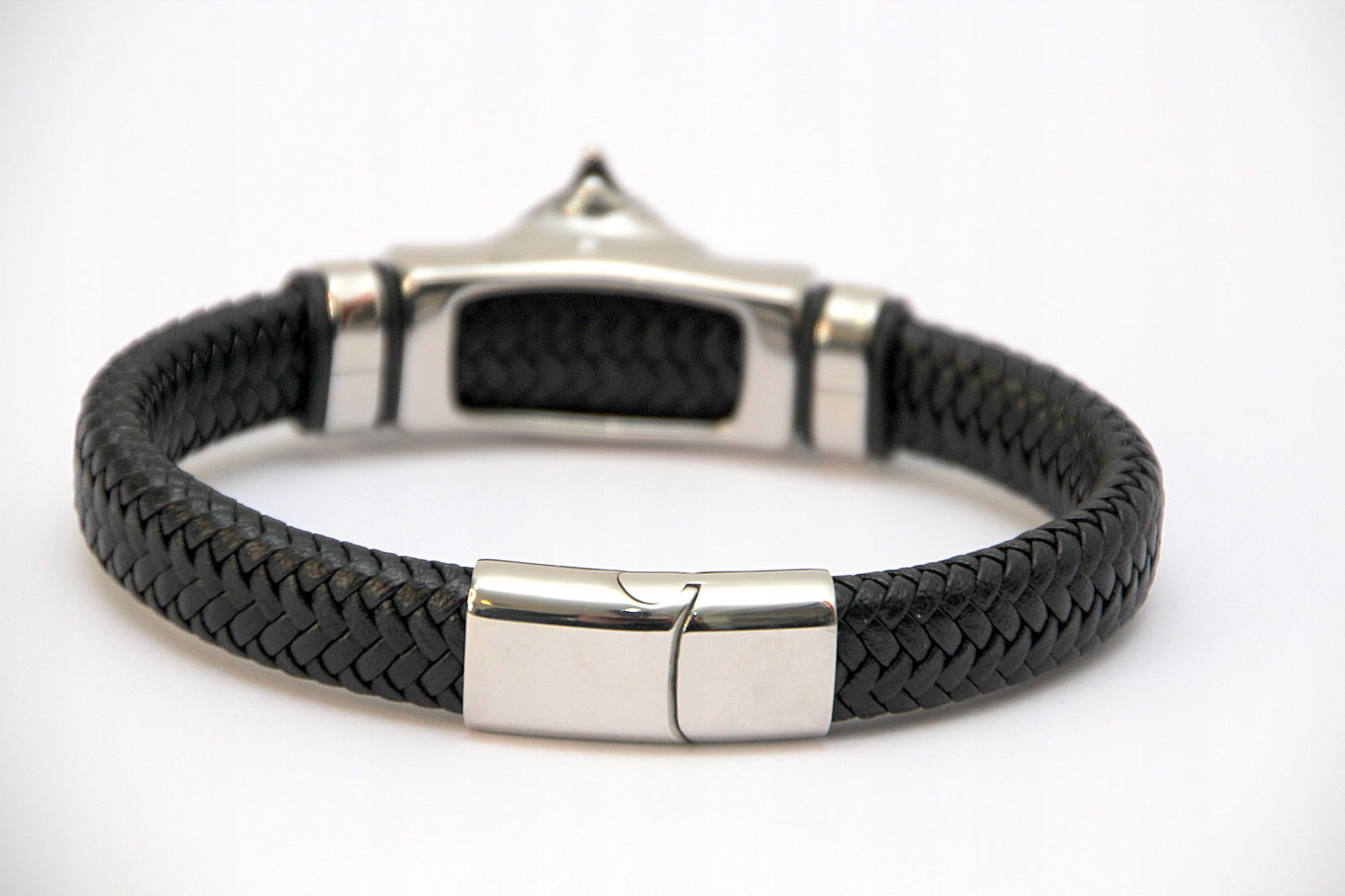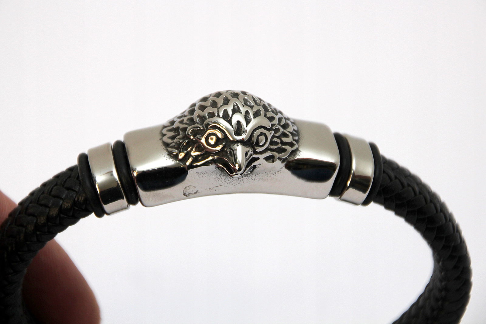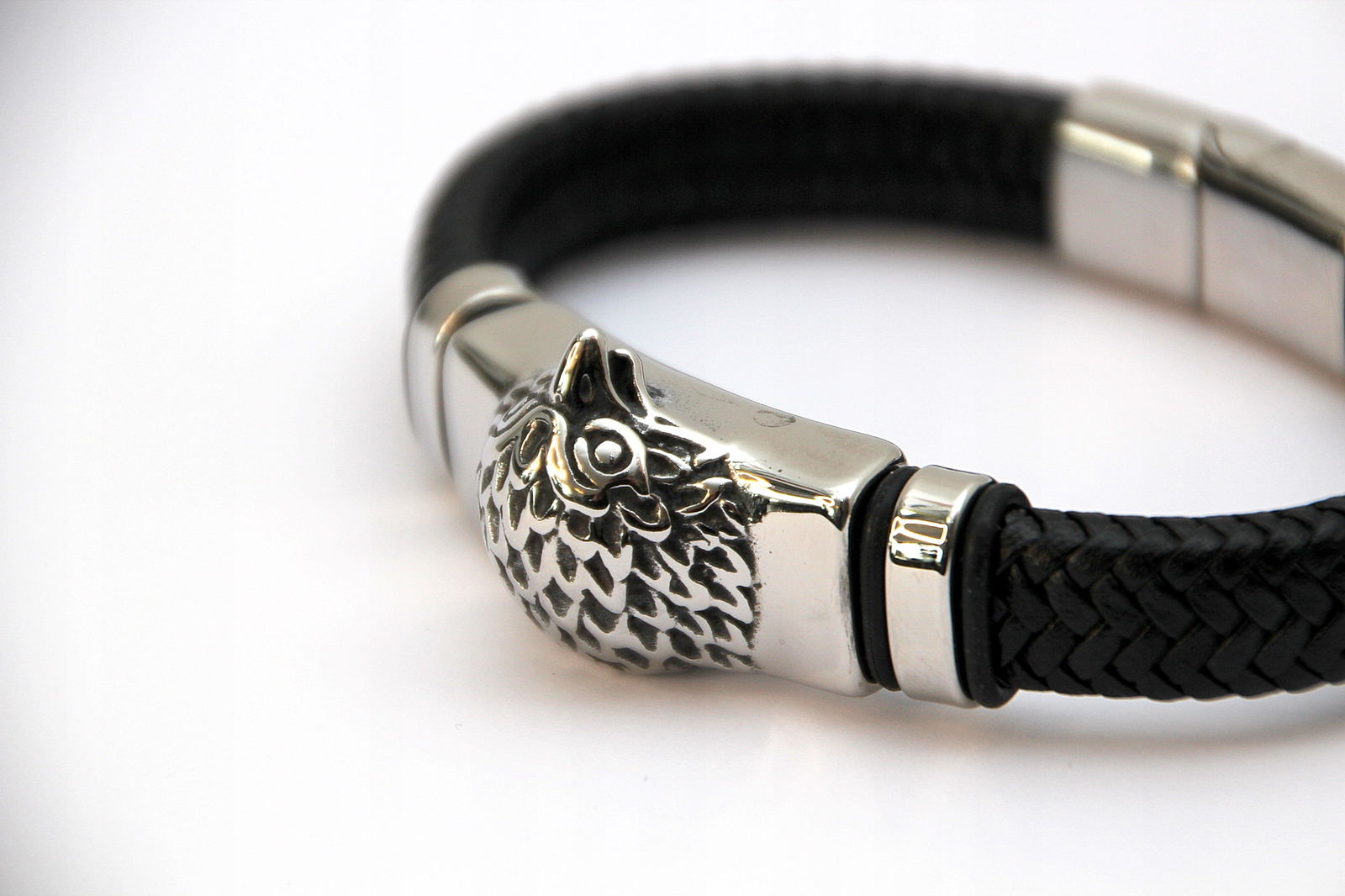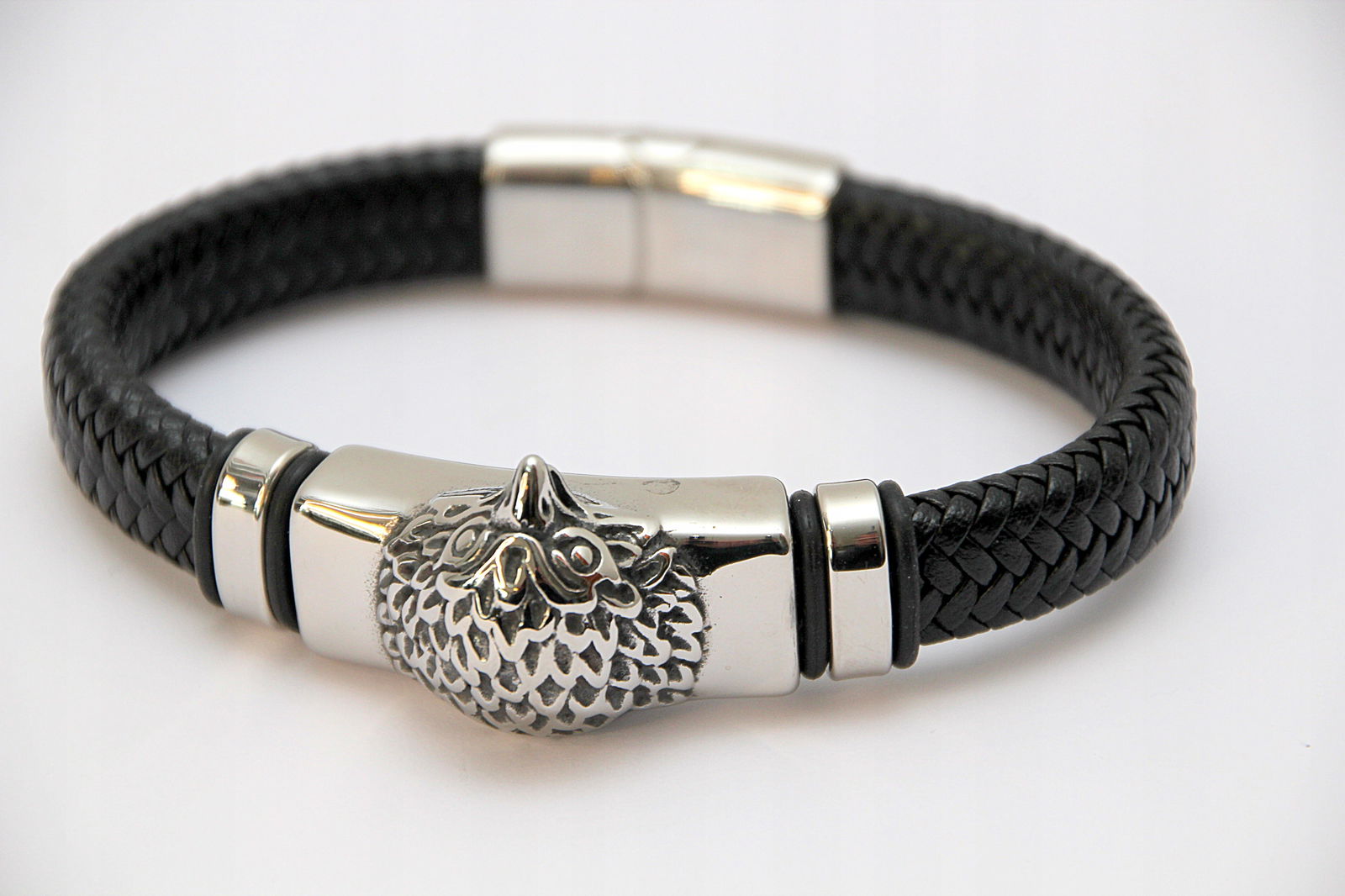 Bransoleta wykonana z grubego rzemienia naturalnego w kolorze czarnym oraz przekładki z motywem głowy orła. Wykończona jest wygodnym i łatwym w użyciu zapięciem na magnes.