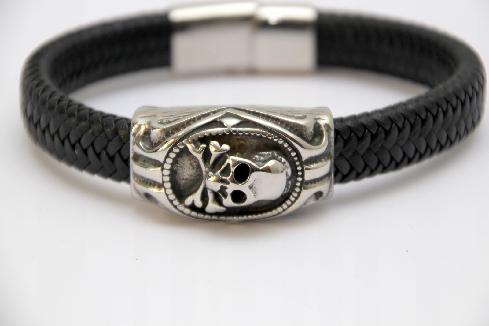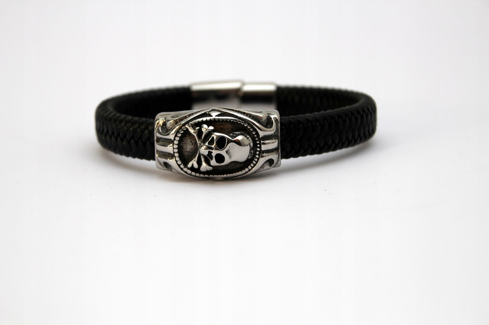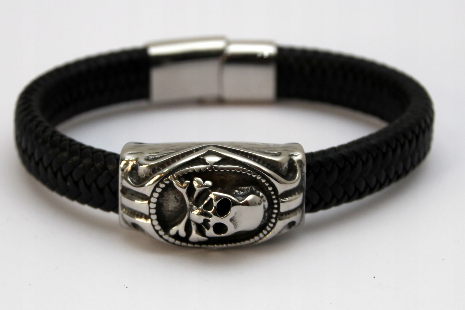 Bransoleta wykonana z grubego rzemienia naturalnego w kolorze czarnym oraz przekładki z motywem czaszki. Wykończona jest wygodnym i łatwym w użyciu zapięciem na magnes.