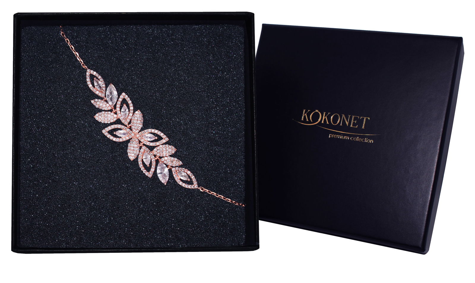 Dalma rose to przykład eleganckiej ślubnej bransoletki z motywem rustykalnym w wydaniu glamur. Biżuterii z tej serii przewodzi motyw listków łączący większe i mniejsze cyrkonie tworząc estetyczną całość. Na końcu strony znajdziesz do kompletu perfekcyjnie dopasowany naszyjnik oraz kolczyki.