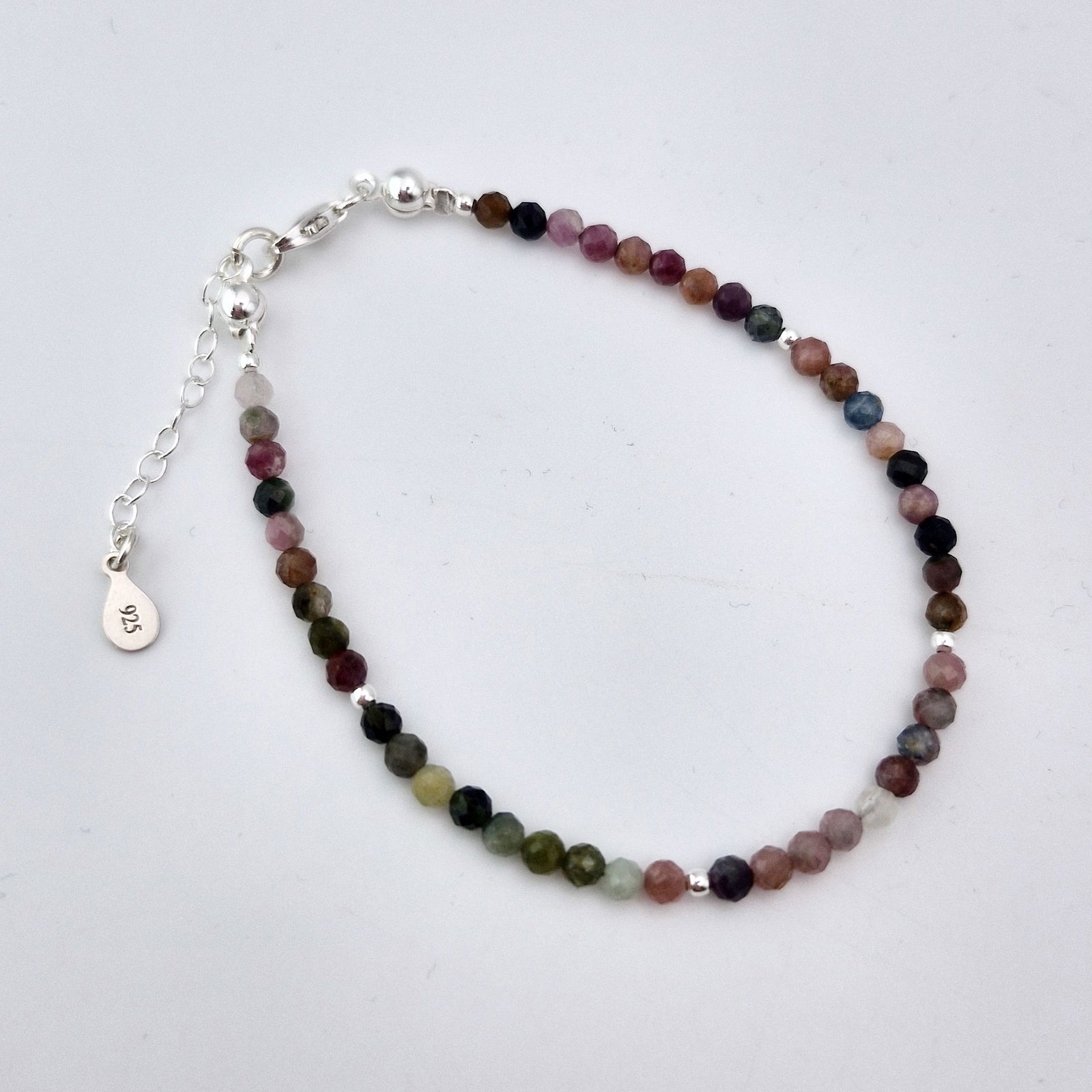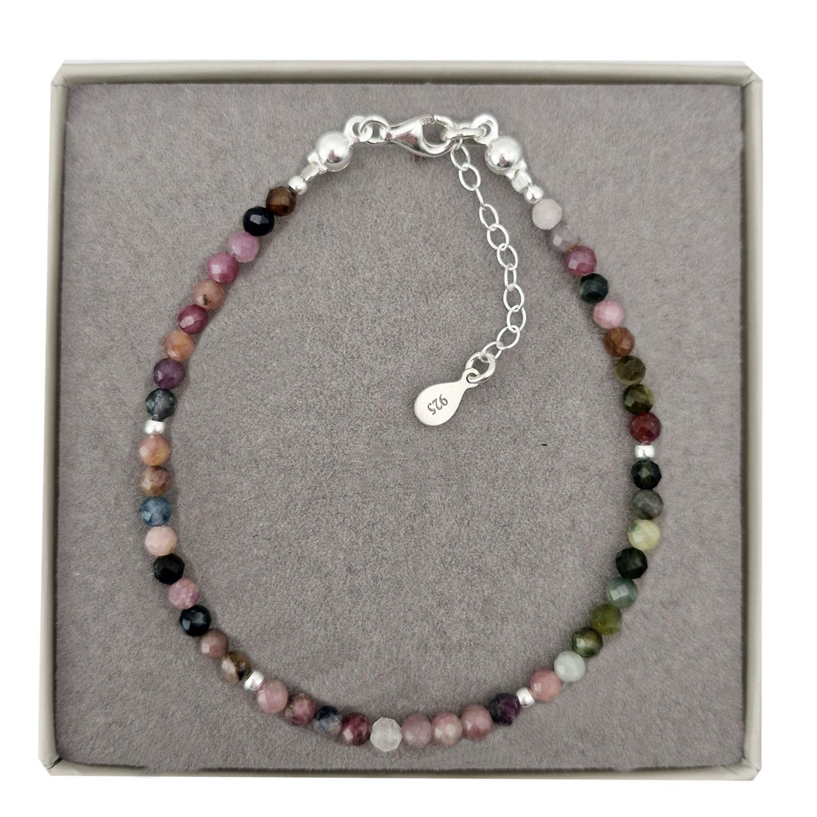 Oferujemy Państwu bransoletkę wykonaną z kamieni naturalnych - kolorowych, szlifowanych turmalinów oraz ze srebra próby 925.