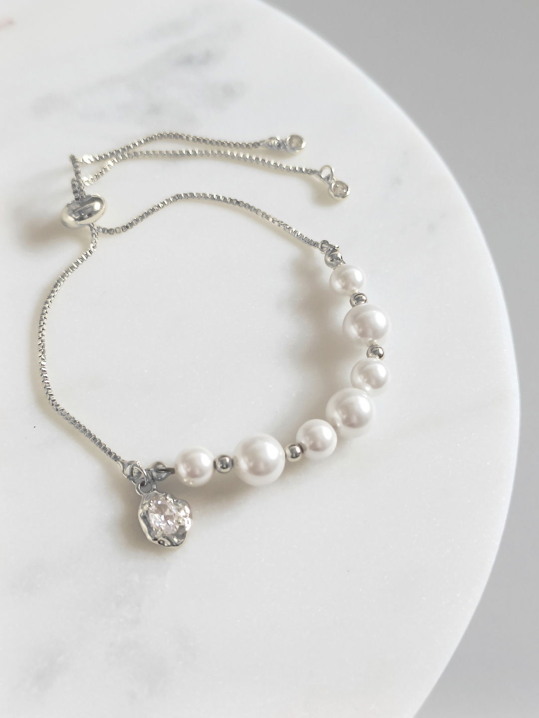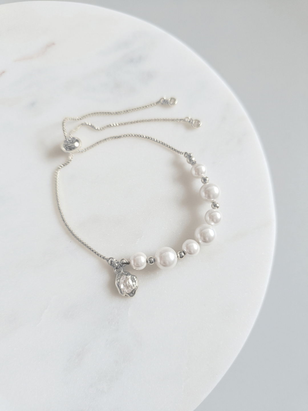 Elegancka i delikatna srebrna bransoletka z perłami STELLA to połączenie klasycznego satynowego blasku pereł seashell z nowoczesną nieregularną i lustrzaną formą zapięcia oraz zawieszki. Bransoletka została zaprojektowana tak, aby tworzyć perfekcyjny komplet biżuterii ślubnej z kolczykami i naszyjnikiem, lub kolią z tej samej serii. Sama zdecyduj jakie elementy z tej serii będą dla Ciebie odpowiednie.