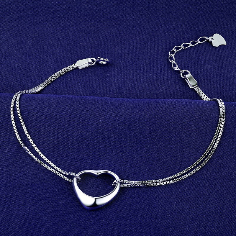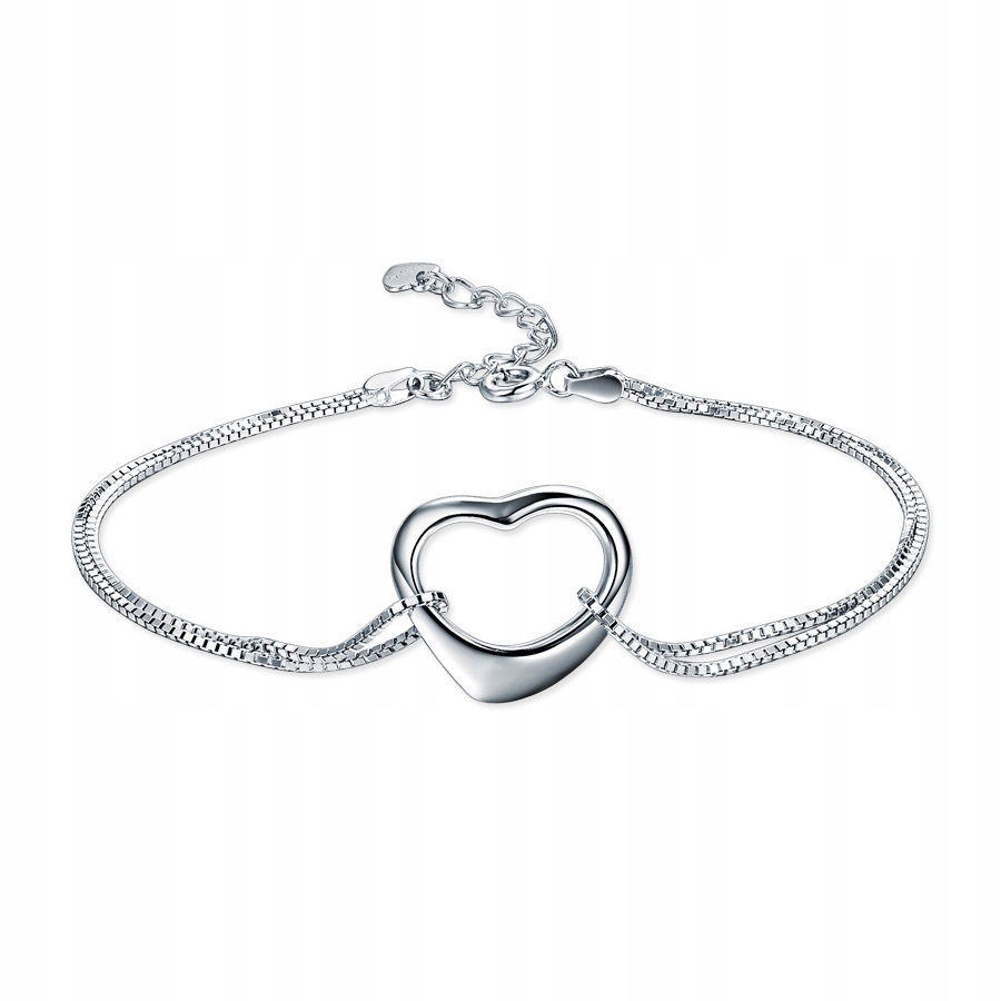 Bransoletka z podwójnym łańcuszkiem i motywem serca wykonana została ze srebra próby 925 i ozdobiona centralnym, ażurowym elementem w kształcie serca o błyszczącej powierzchni. Srebrny kolor, delikatny splot i regulowane zapięcie sprawiają, że biżuteria wygodnie układa się na nadgarstku. Bransoletka srebrna 925 to subtelny dodatek, idealny do codziennych stylizacji i prezentów.