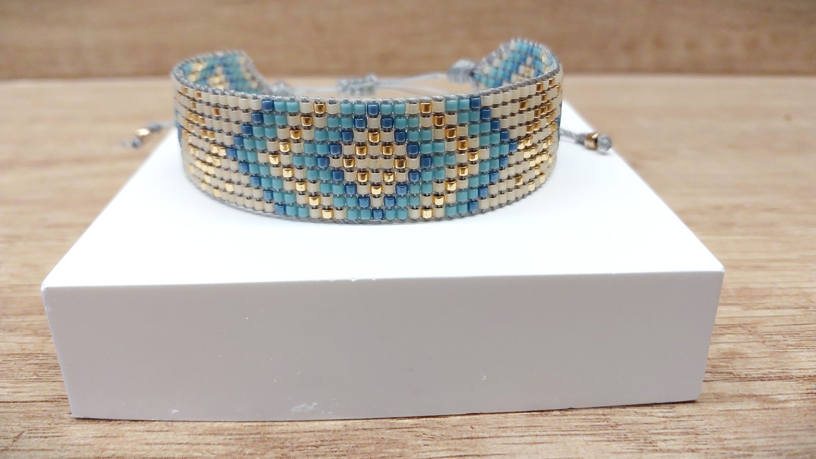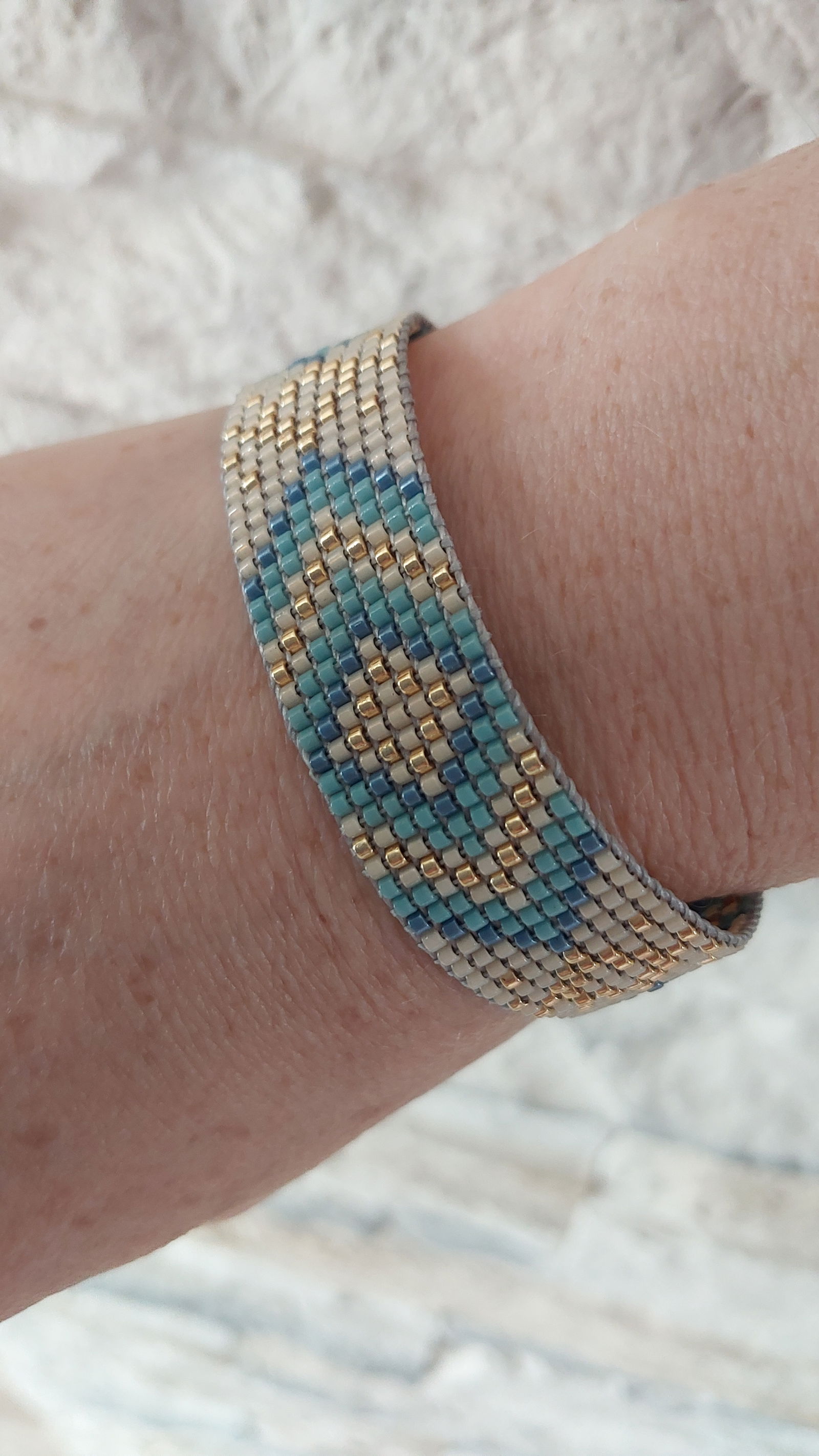 Bransoletka błękitna tkana na krośnie dla kobiet z pięknym dekikatnym wzorem. Wykonana jest z japońskich koralików miyuki ma zapięcie makramowe,przesuwane. Pasuje na obwód nadgarstka od 15cm do 18cm. Szerokość 18mm.