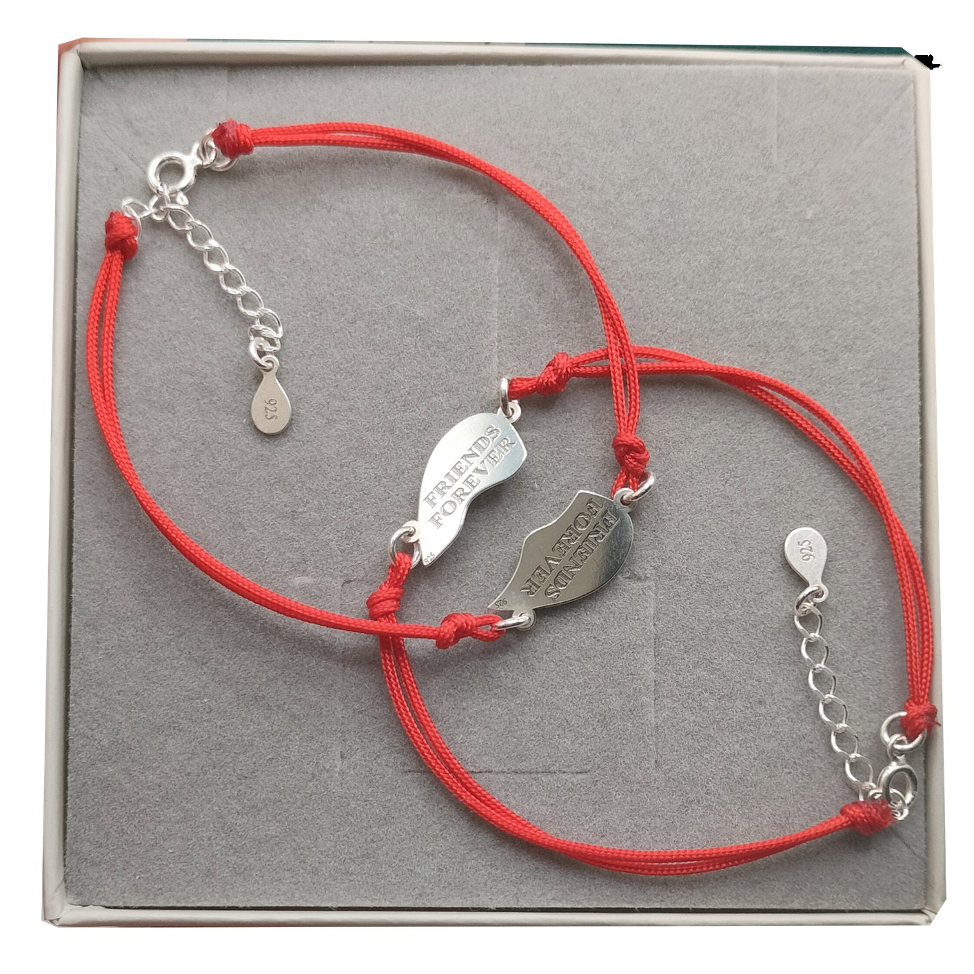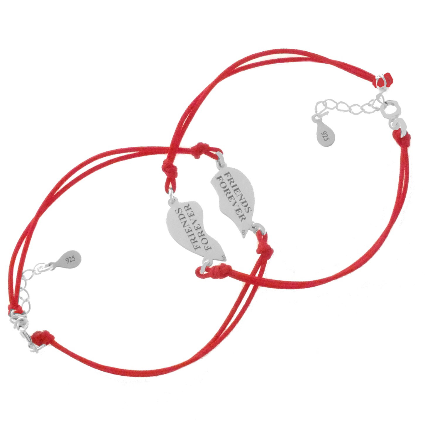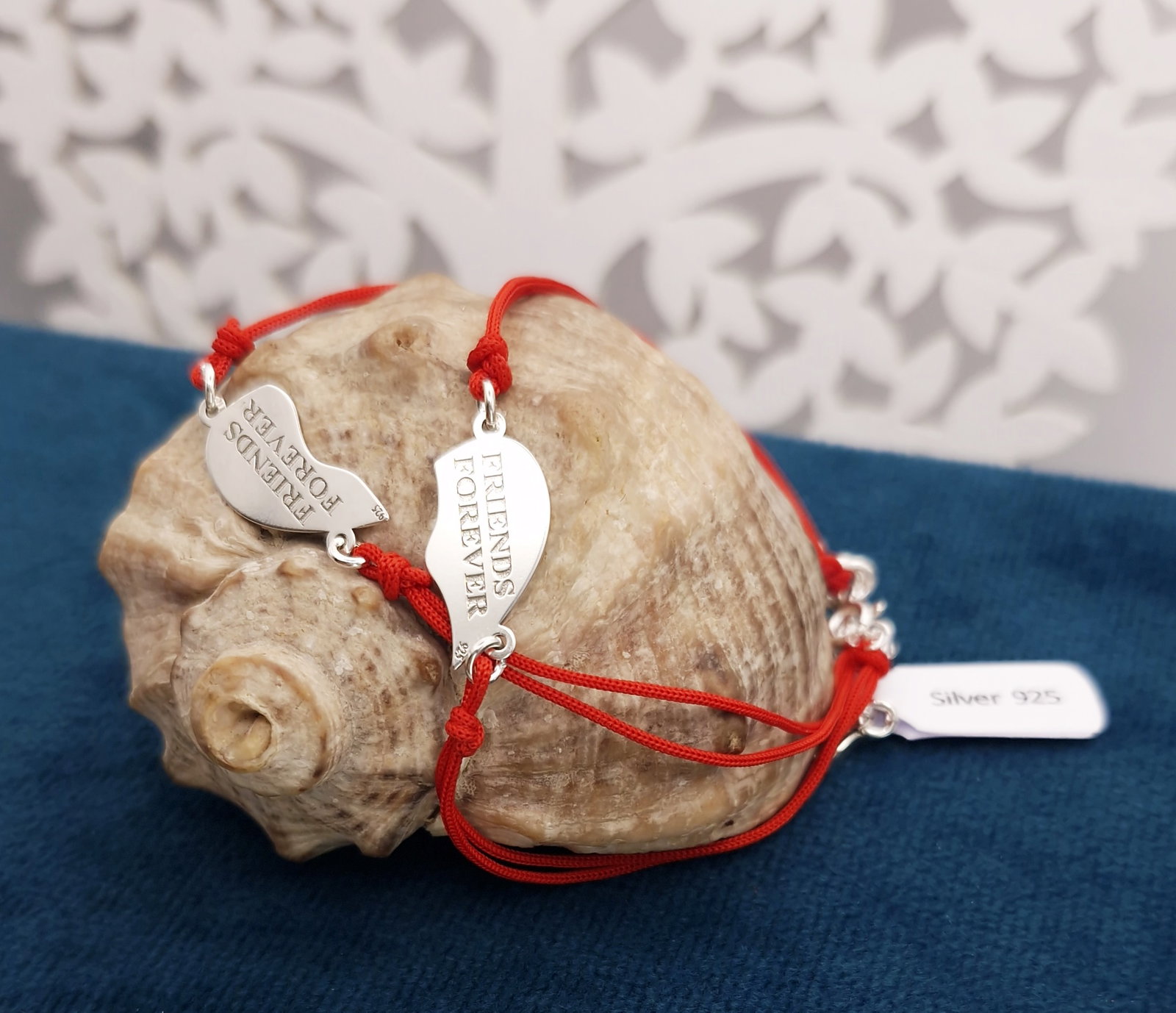 Oferujemy Państwu komplet dwóch bransoletek przyjaźni, wykonanych z ładnego sznurka jubilerskiego który się nie mechaci z zawieszkami w kształcie połówek łamanego serca z napisem "Friends Forever". Zapięcie bransoletek i zawieszki wykonane w całości ze srebra próby 925.