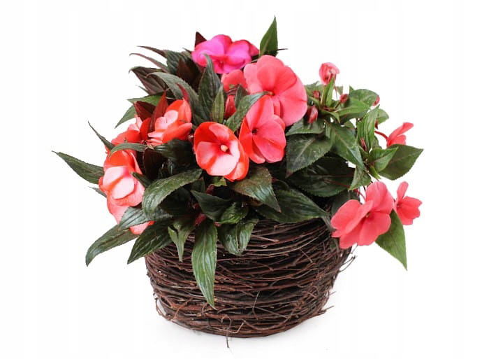 W koszyku ładnie prezentują się zarówno kolorowe kwiaty kwitnące, jak i rośliny zielone.