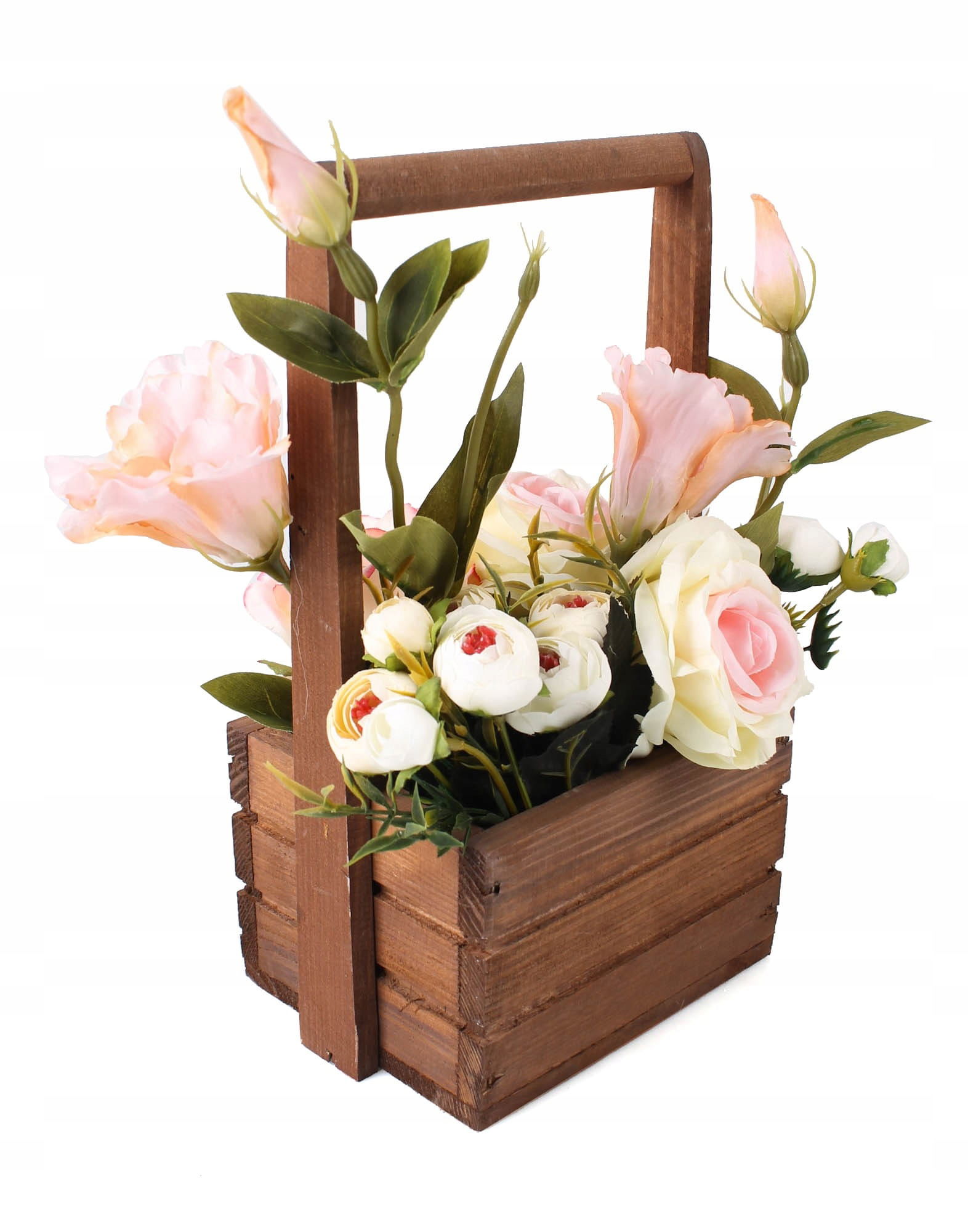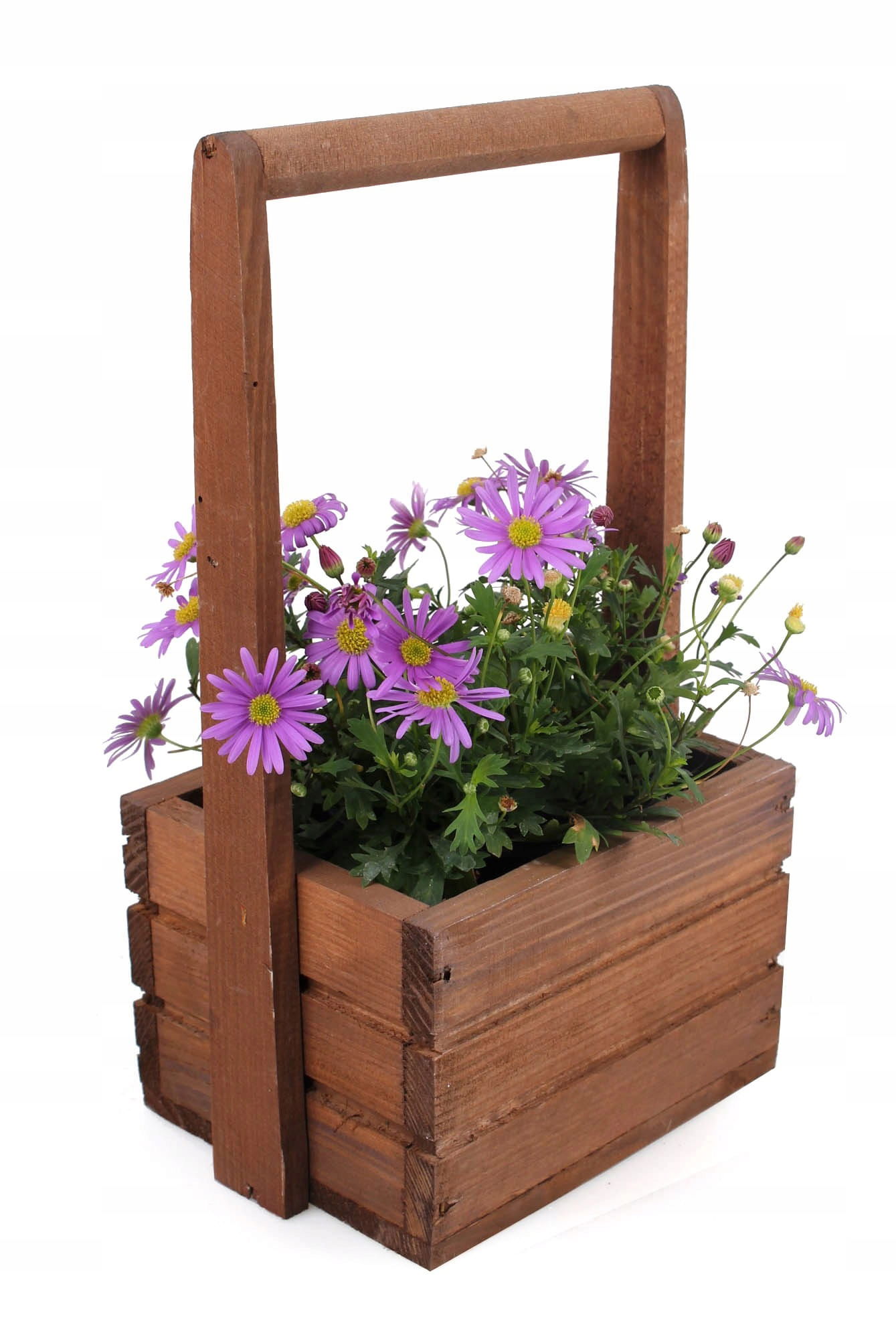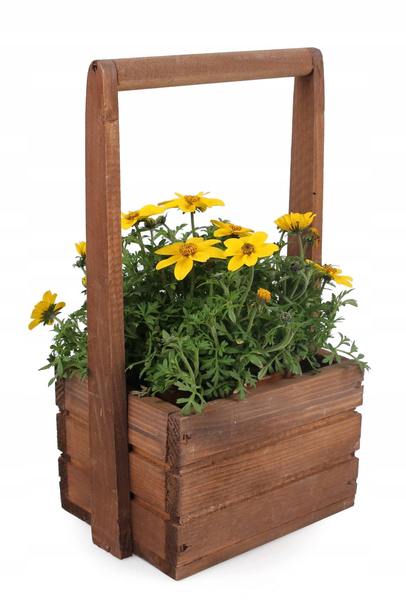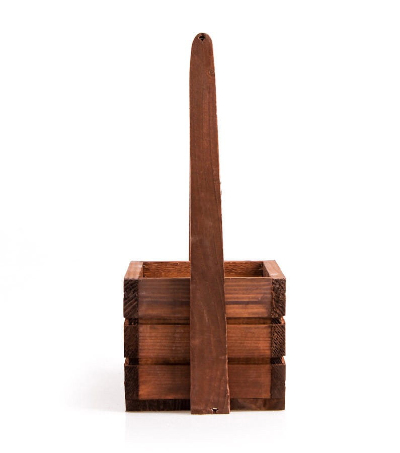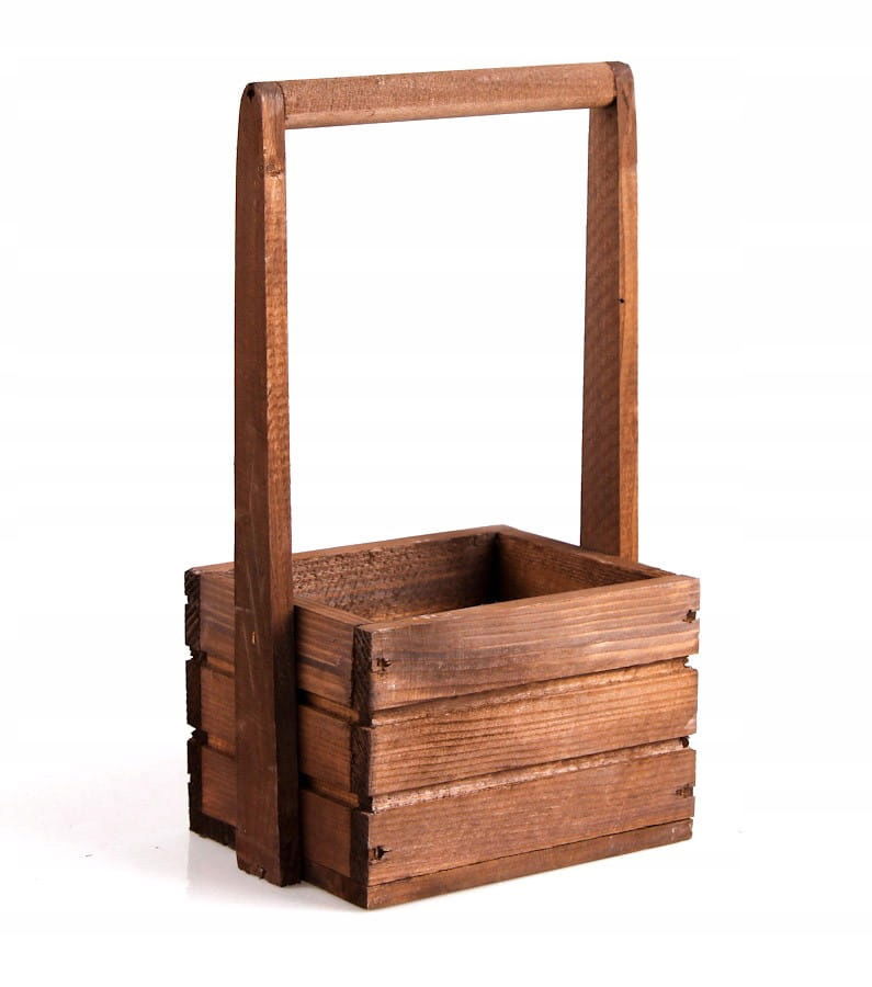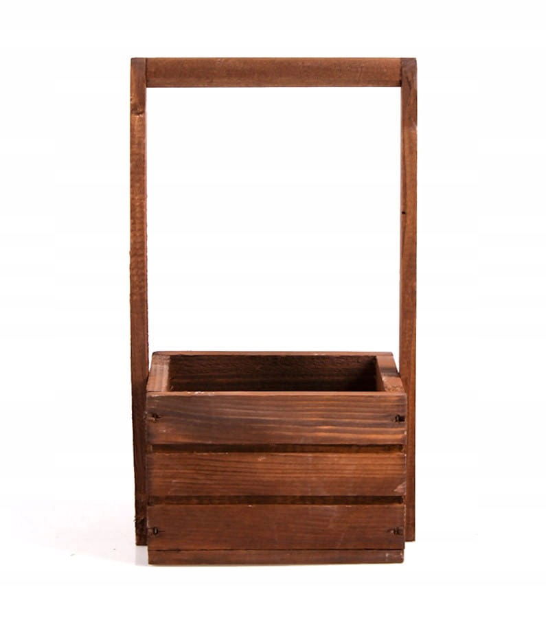 Szukasz sposobu na to, żeby ładnie wyeksponować swoje ulubione rośliny? Drewniana skrzynka z pałąkiem będzie idealna! Możesz włożyć do niej praktycznie każdy mniejszy kwiatek czy chociażby świeże zioła takie jak: bazylię lub tymianek. Brązowy kolor skrzynki podkreśli różnobarwność rośliny oraz zieleń jej liści i łodyg.