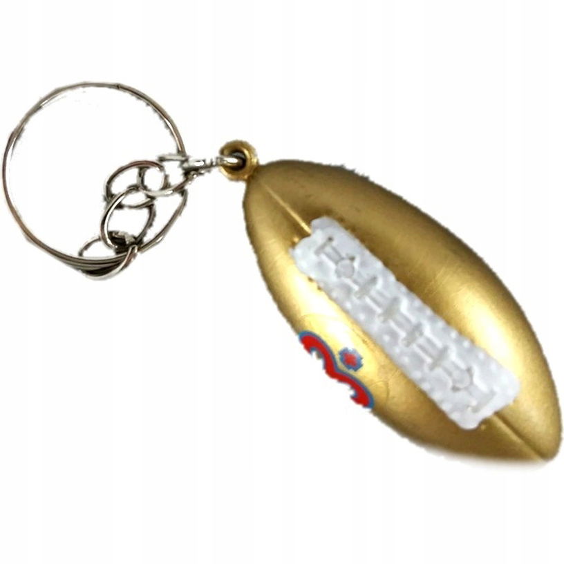 Brelok do kluczy w kształcie piłki do futbolu amerykańskiego o średnicy 6 cm, w kolorze złotym. Stylowy gadżet dla fanów sportu, wykonany z trwałego materiału, lekki i poręczny.