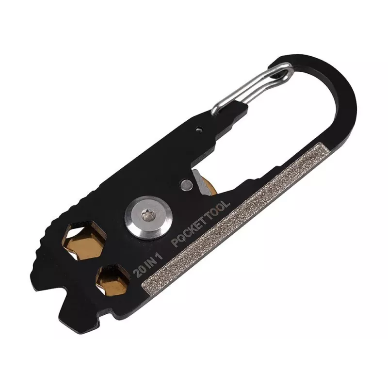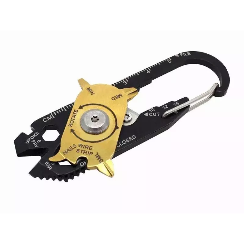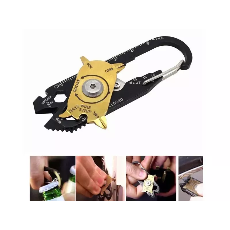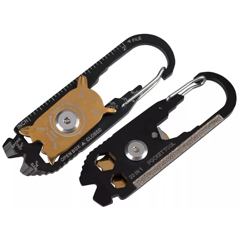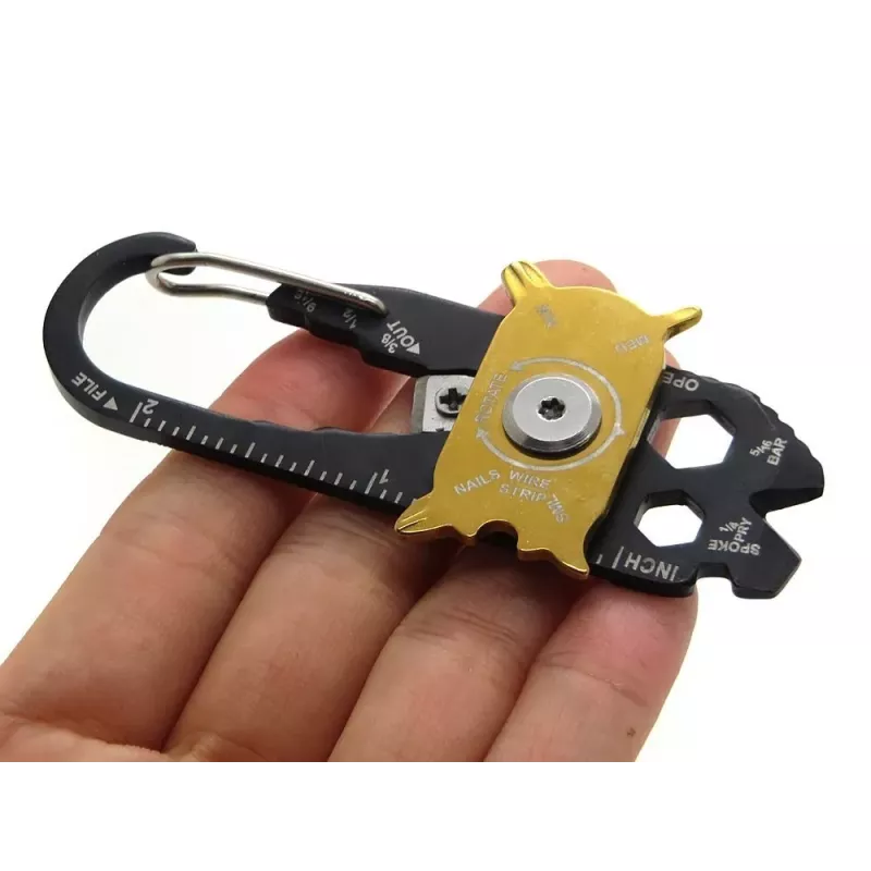 Poręczny karabińczyk który może być niezbędny na co dzień, Jest niewielkich rozmiarów, zmieści się w kieszeni. Możemy go również przypiąć do kluczy aby zawsze mieć go przy sobie. Posiada 20 różnych narzędzi przydatnych w każdej sytuacji. Można go ze sobą zabrać na wycieczkę do lasu, na kemping,
