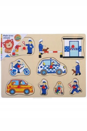 Drewniane puzzle z pinezkami z motywem policji firmy TOP BRIGHT. Układanka zawiera 8 elementów przedstawiające pojazdy, budynek oraz personel który jest odpowiedzialny za odpowiedzialną służbę policji. Produkt wykonany jest z ekologicznego, wysokiej jakości drewna, bez BPA. Barwione nietoksyczną farbą na bazie wody, zgodnie z najwyższymi międzynarodowymi standardami bezpieczeństwa zabawek. Zabawka o wymiarach: 30x22,5x1,5cm. Zabawka przeznaczona dla dzieci od 10m+.