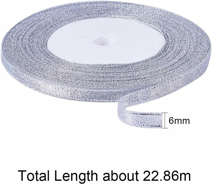 Wstążka PH PandaHall 6 mm z brokatem, 25 jardów, metaliczna, srebrna, świąteczna wstążka do pakowania, dwustronna, brokatowa wstążka organzowa, materiał do samodzielnego wykonania kokardy organzowej, dekoracji kwiatowej na wesele