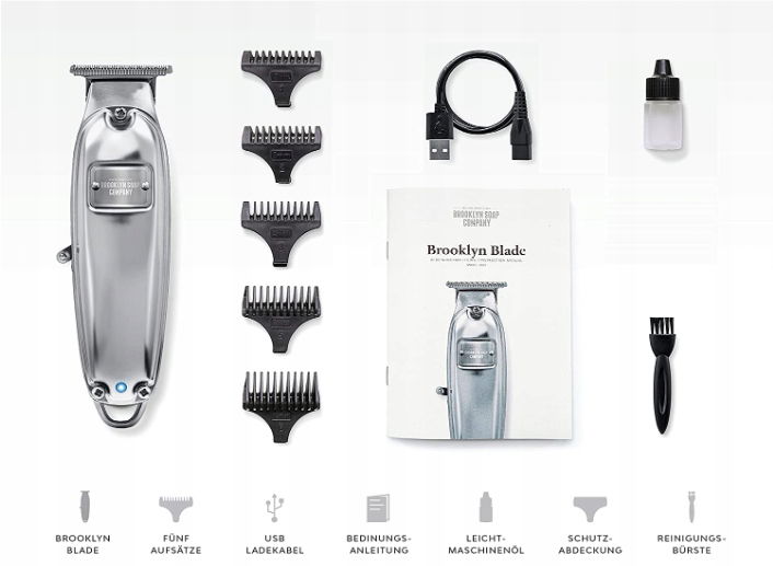 - ZAKRES DOSTAWY: Oprócz naszego Brooklyn Blade otrzymasz 5 nasadek do indywidualnego stylu zarostu, szczoteczkę do czyszczenia, lekki olej maszynowy, kabel ładujący USB i instrukcję obsługi.