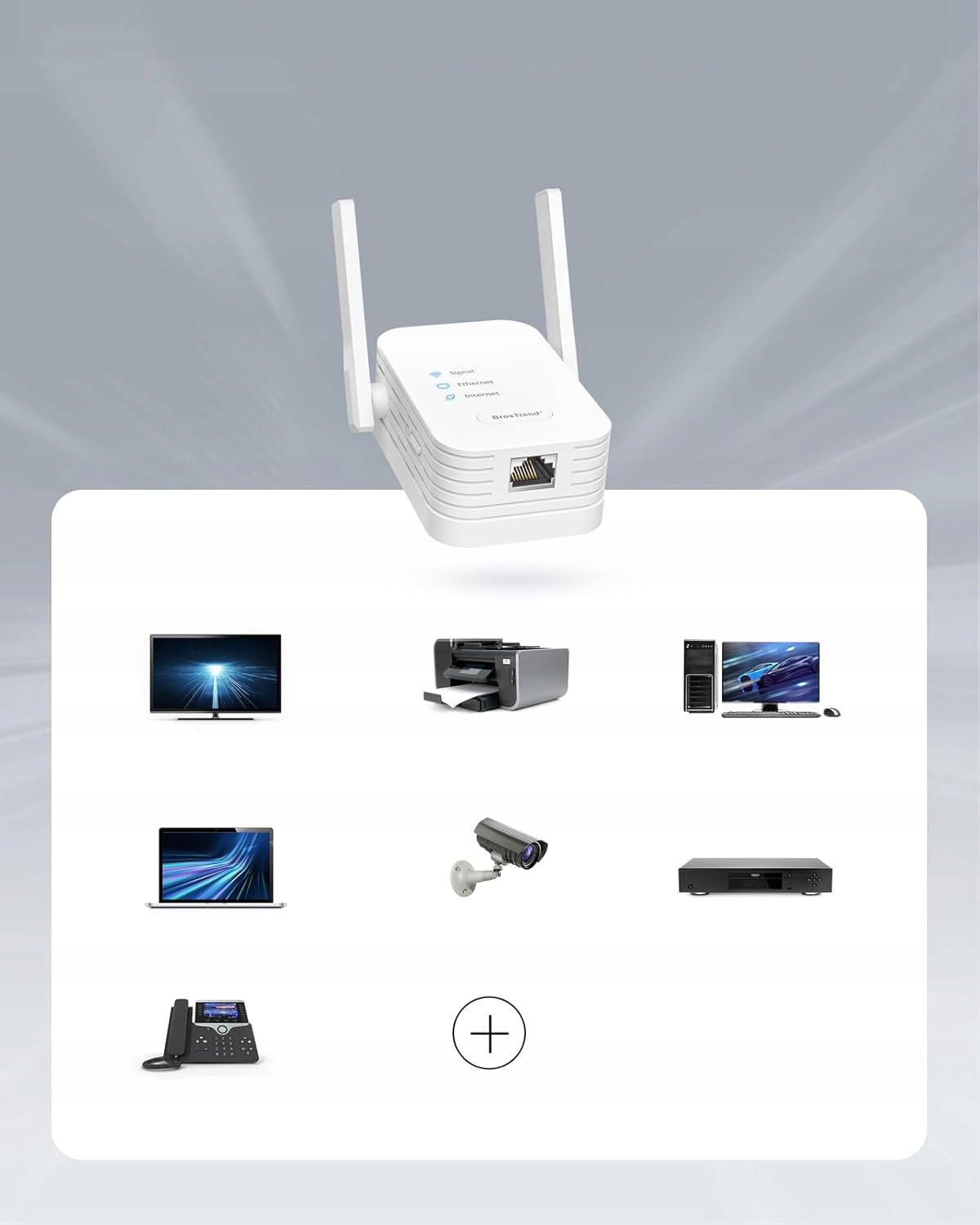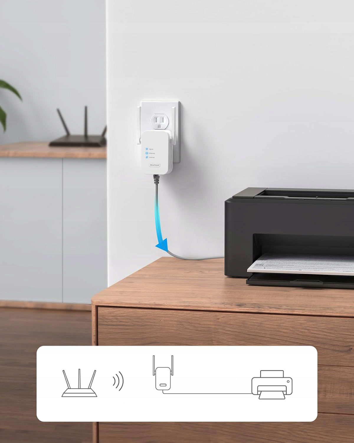 Adapter WiFi do Ethernetu marki BrosTrend umożliwia podłączenie urządzeń pozbawionych modułu WiFi do sieci bezprzewodowej. Dzięki temu telewizory, drukarki, komputery i inne urządzenia LAN-only mogą korzystać ze stabilnego połączenia internetowego bez konieczności prowadzenia kabli w całym domu lub biurze.