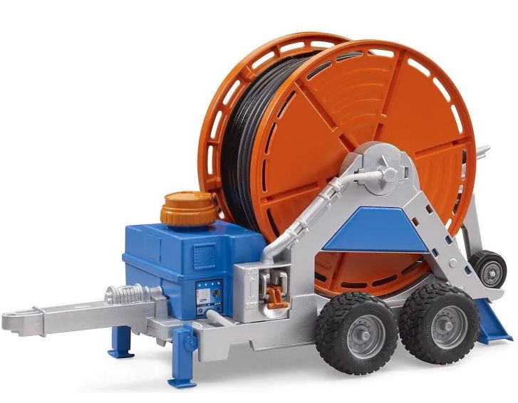 Niezależnie od miejsca czy jest to boisko sportowe, szkółka drzew, sad czy inny duży obszar, wszędzie tam, gdzie wymagane jest równomierne i stałe zaopatrzenie w wodę wykorzystuje się przyczepy zraszaczowe. Ta ważna maszyna dla udanego rolnictwa jest nowością w bogatej ofercie firmy Bruder. Młodzi rolnicy mogą rozwinąć wąż o długości 1,8 metra za pomocą obsługiwanego korbą bębna na wąż, do którego przymocowany jest szczegółowy wóz opryskiwacza. Zgodnie z rzeczywistym sprzętem zainstalowano zbiornik z działającą pompą. Dzięki systemowi pomp woda może być łatwo i realistycznie rozprowadzana.