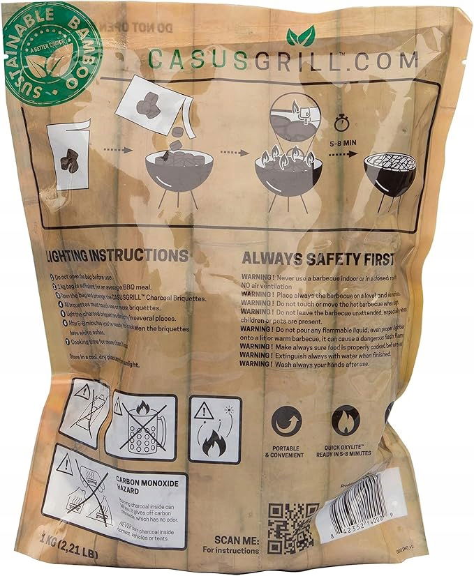 CasusGrill to innowacyjne rozwiązanie dla miłośników grillowania, którzy szukają wygody, ekologicznych materiałów i szybki czas rozpalania. Dzięki nowoczesnej technologii Quick Oxylite™, węgiel bambusowy w tym specjalnym worku jest gotowy do użycia w ciągu zaledwie 5-8 minut, bez potrzeby używania rozpałki czy żelu! Jest to doskonały wybór dla każdego, kto ceni szybkie, efektywne i czyste grillowanie, bez zbędnych preparatów.