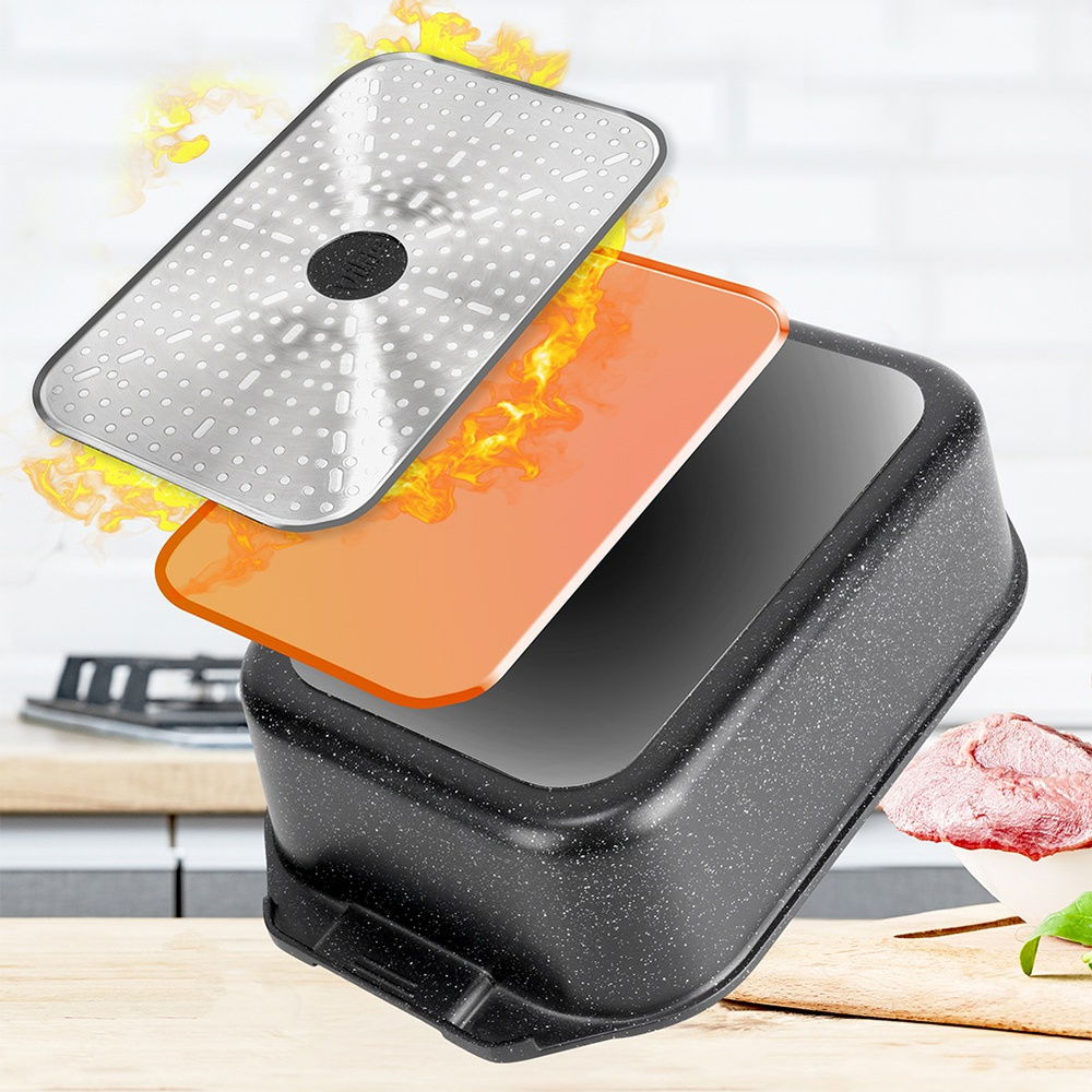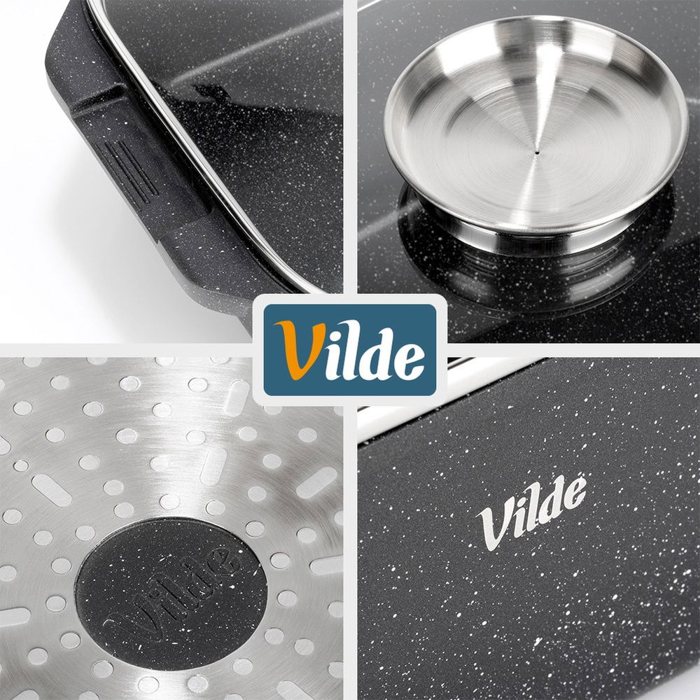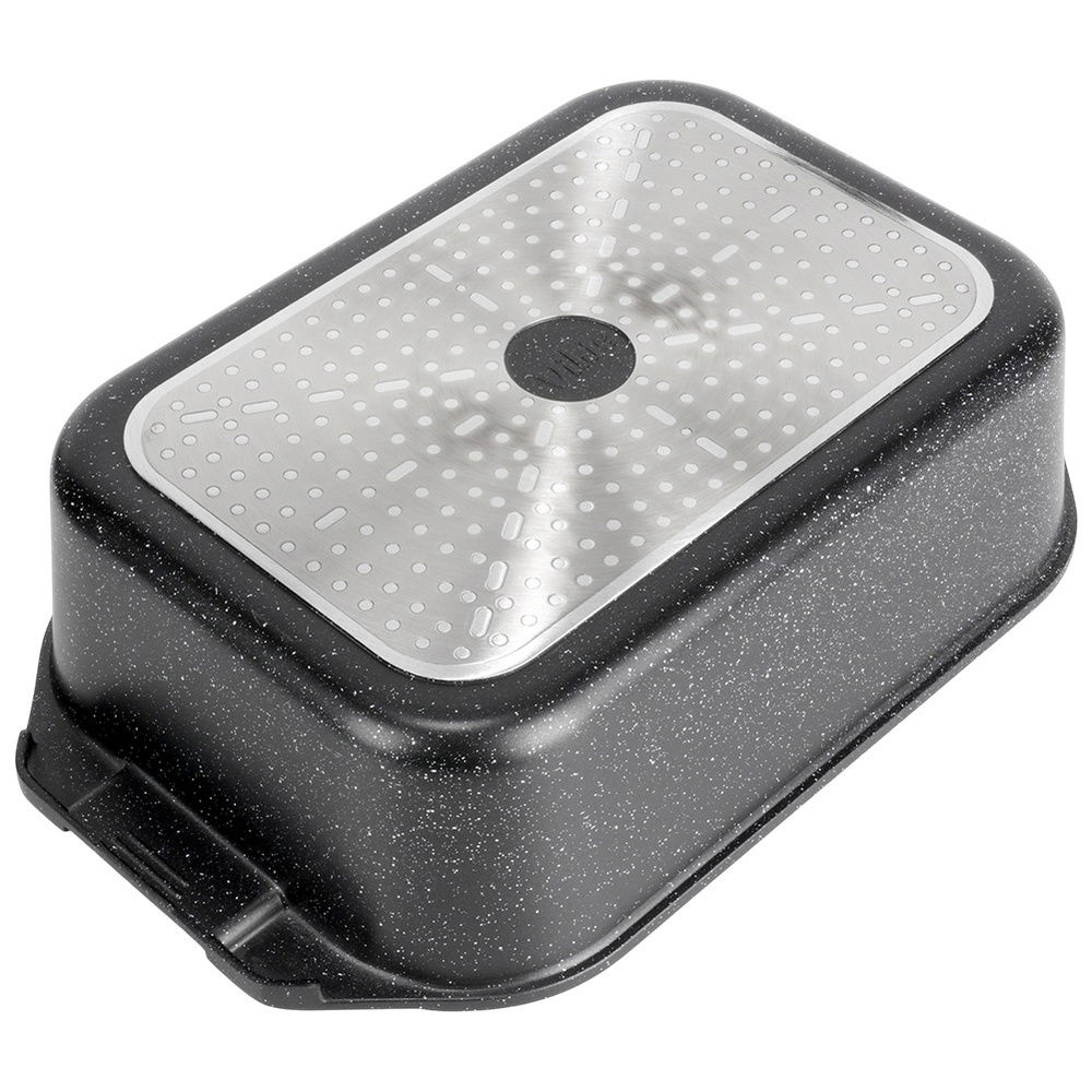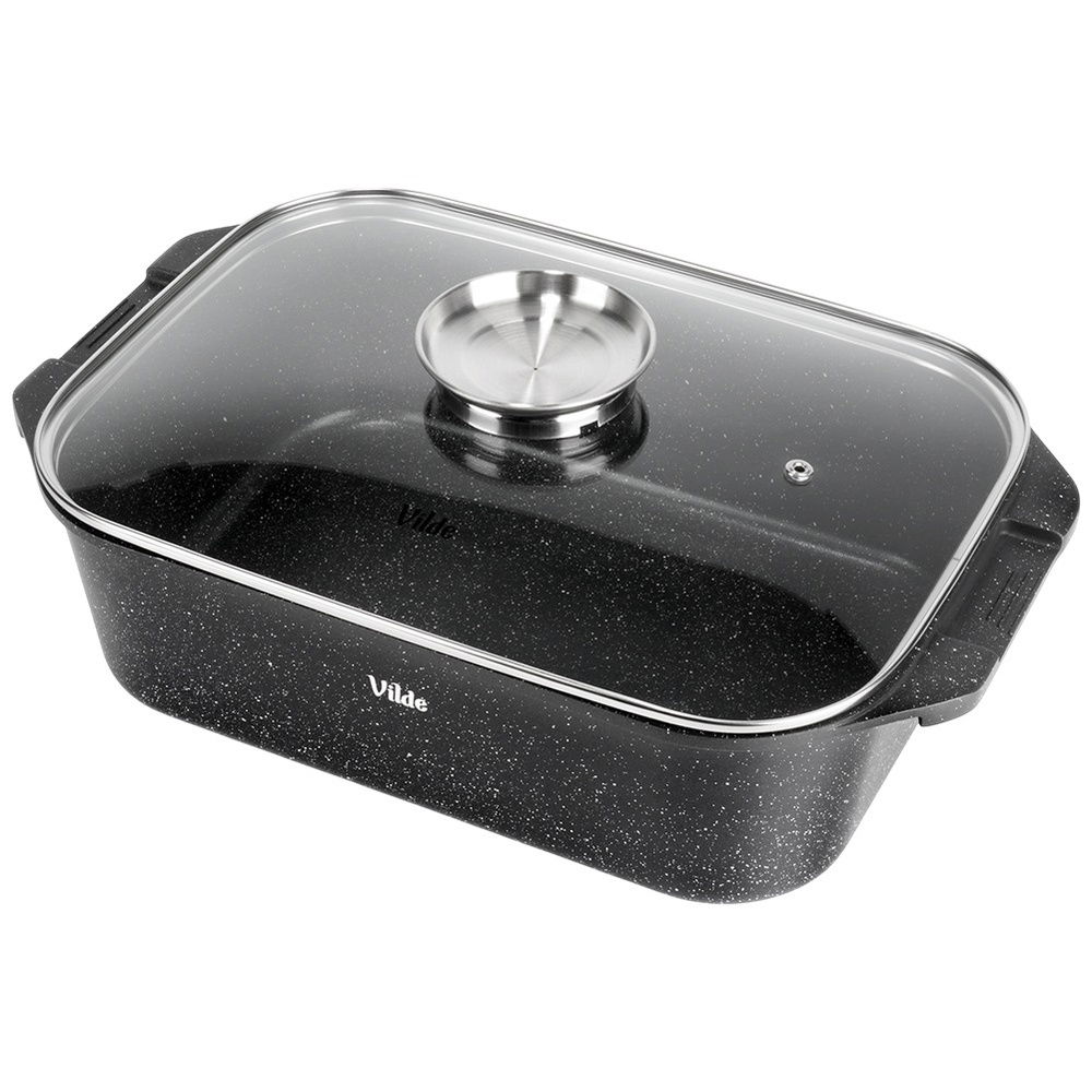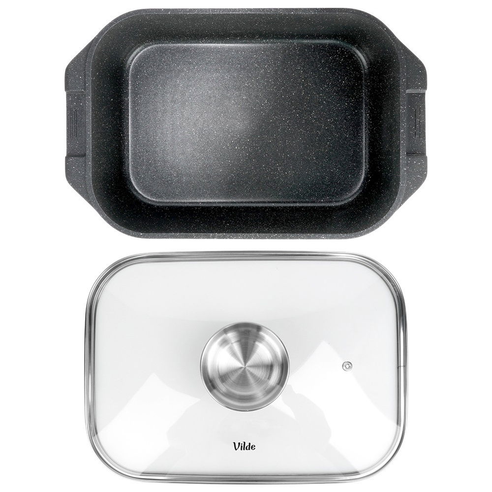 Prostokątna brytfanna z pokrywą szklaną. Brytfanna jest niezwykle funkcjonalna. Idealnie sprawdzi się do duszenia, pieczenia oraz gotowania potraw. Pokrywka z funkcją patelni grillowej oraz osobnym indukcyjnym dnem doskonale sprawdza się do smażenia potraw. Zestaw ten jest niezwykle przydatny w każdej kuchni.
