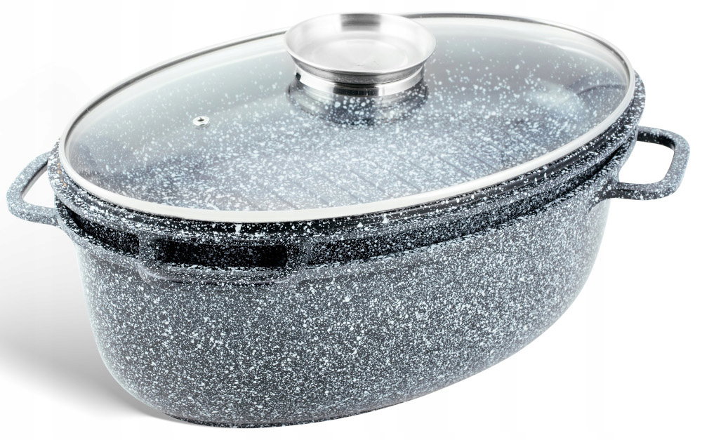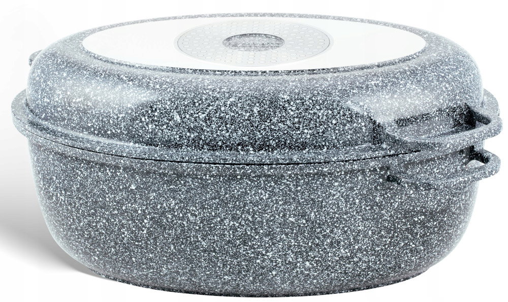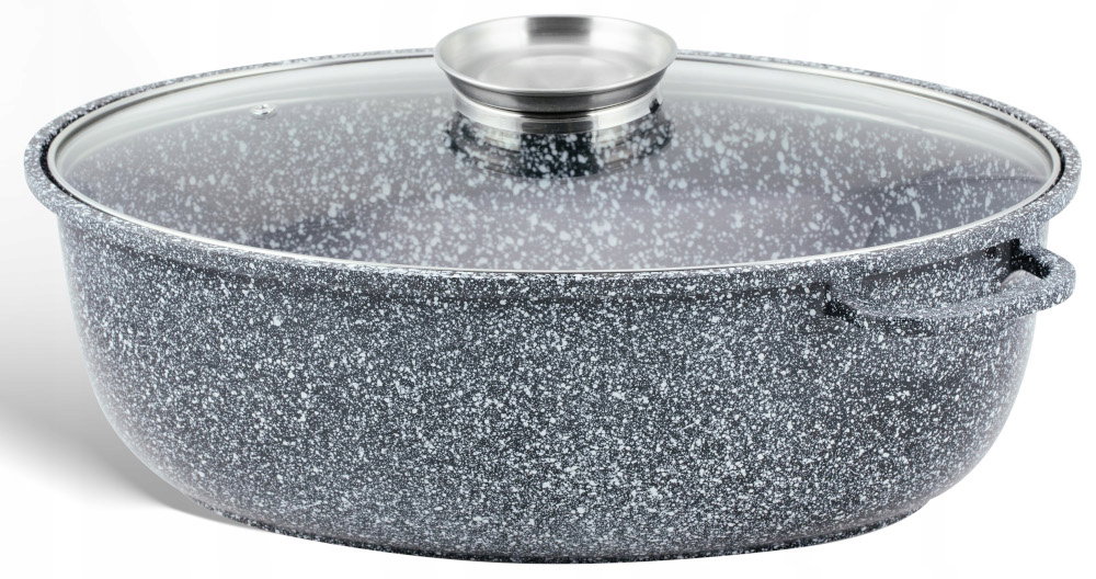 Brytfanna ceramiczno-marmurowa wykonana jest z trwałego stopu aluminium z powłoką marmurową, równomiernie i szybko rozprowadza ciepło i jest prosta w czyszczeniu.