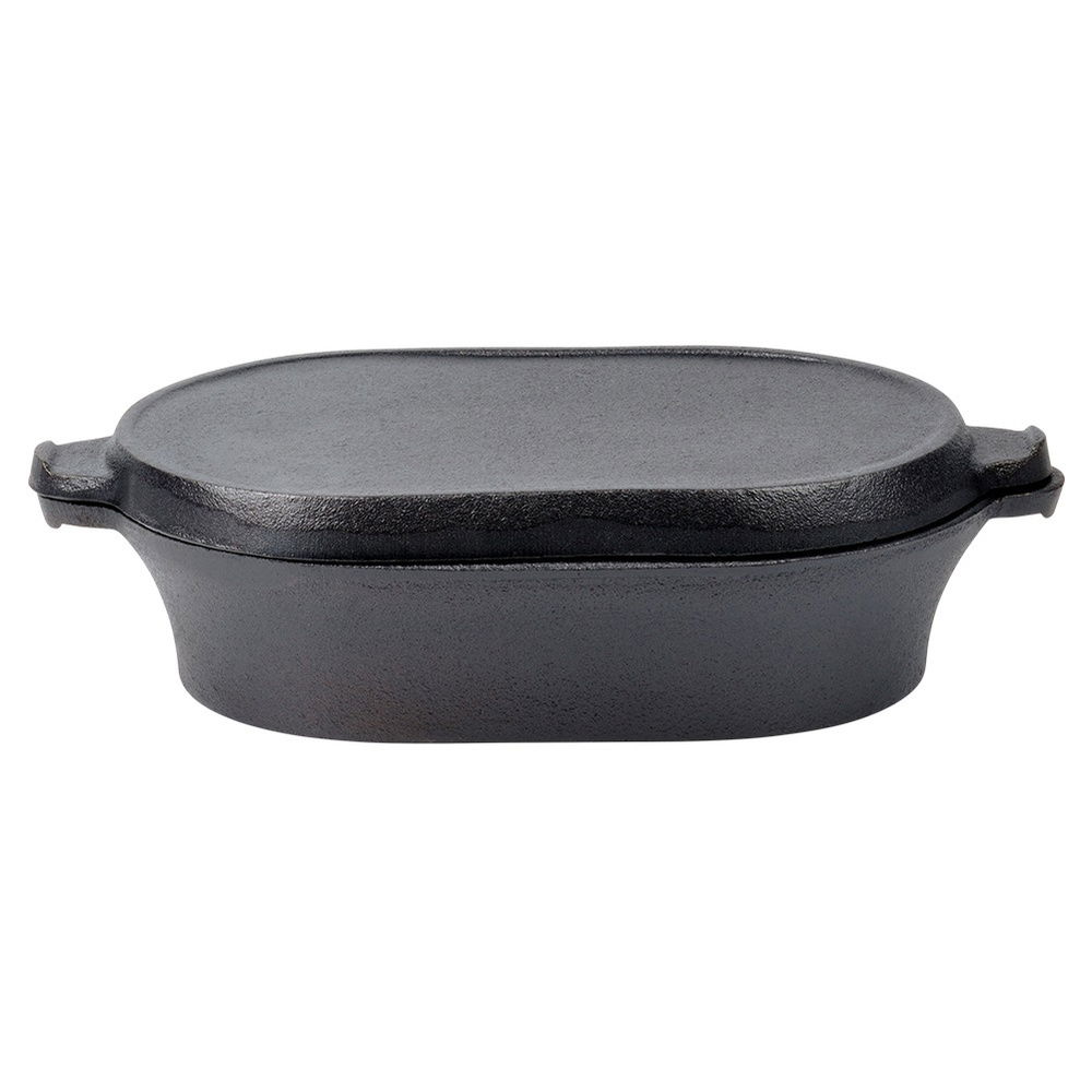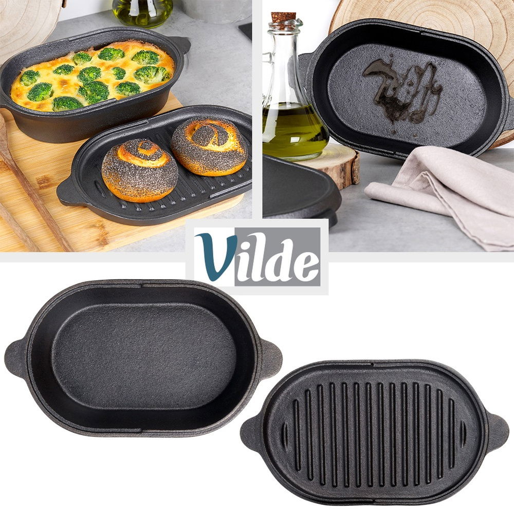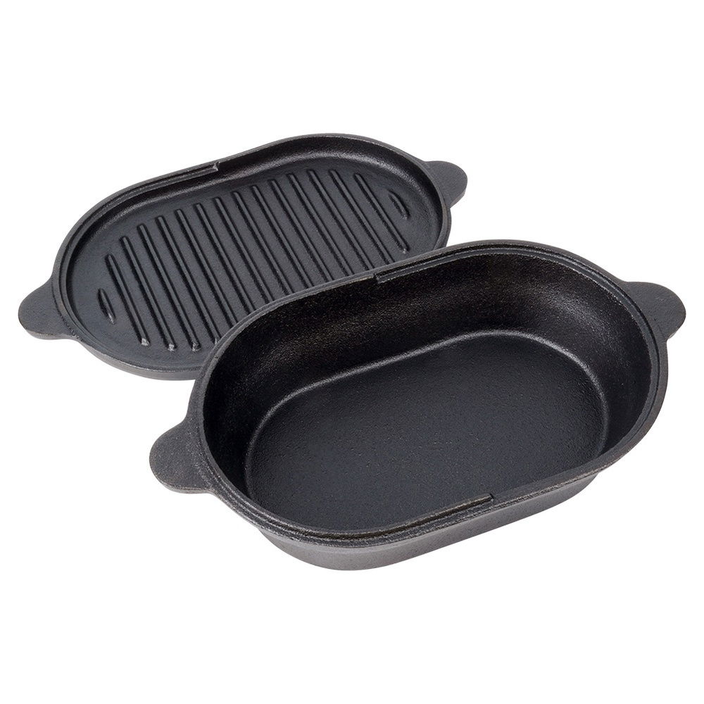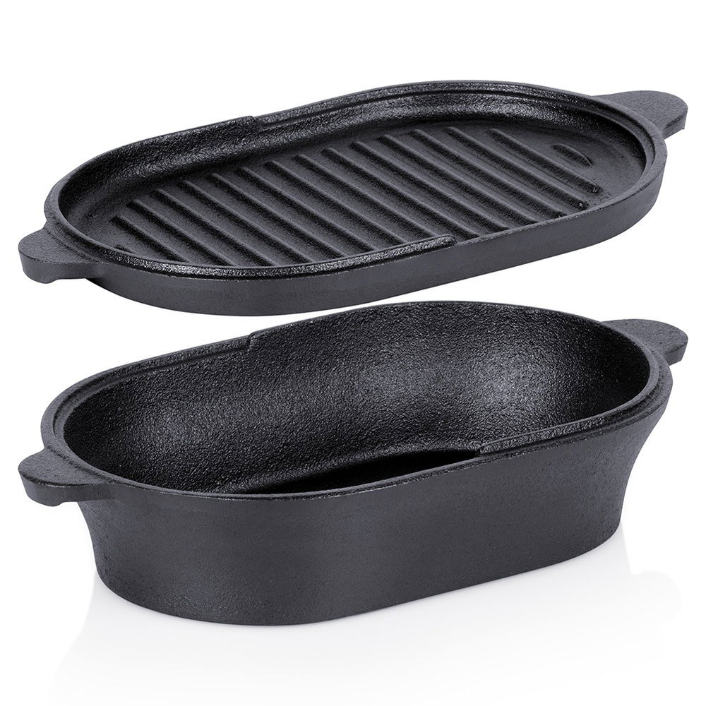 Brytfanna żeliwna 2w1 - Mała brytfanna z pokrywką, która stanowi również osobne naczynie do zapiekania. Brytfanna doskonale nadaje się do pieczenia, duszenia i zapiekania mięs, warzyw, ziemniaków. Po zdjęciu pokrywki uzyskujemy dwa oddzielne naczynia. Wymiary zewnętrzne brytfanny bez pokrywki: 28 x 16 x 5,5 cm, wysokość z pokrywką wynosi 7,2 cm, a pojemność l. Pokrywka żeliwna z powierzchnią grillową ma wymiary 28 x 16 x 2 cm.